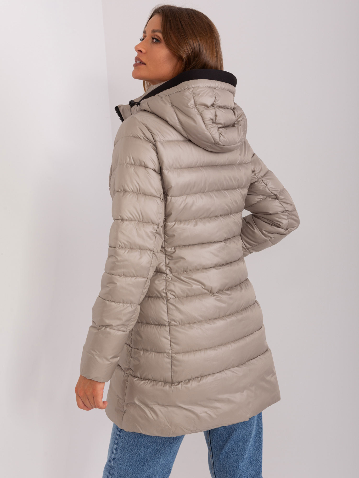 Ciemnobeżowa damska kurtka zimowa z kapturem .