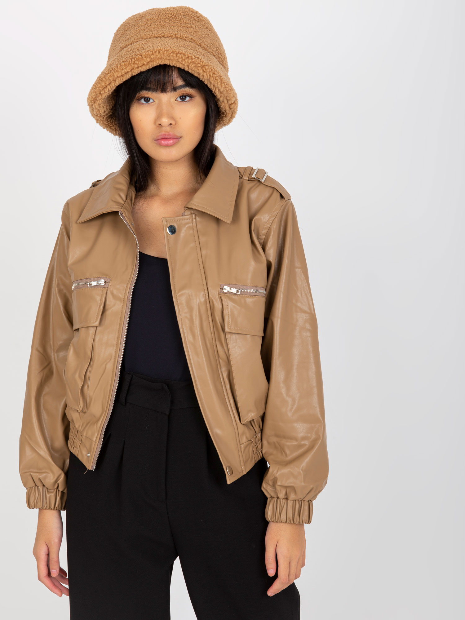 Ciemnobeżowa krótka kurtka z ekoskóry z kieszeniami .