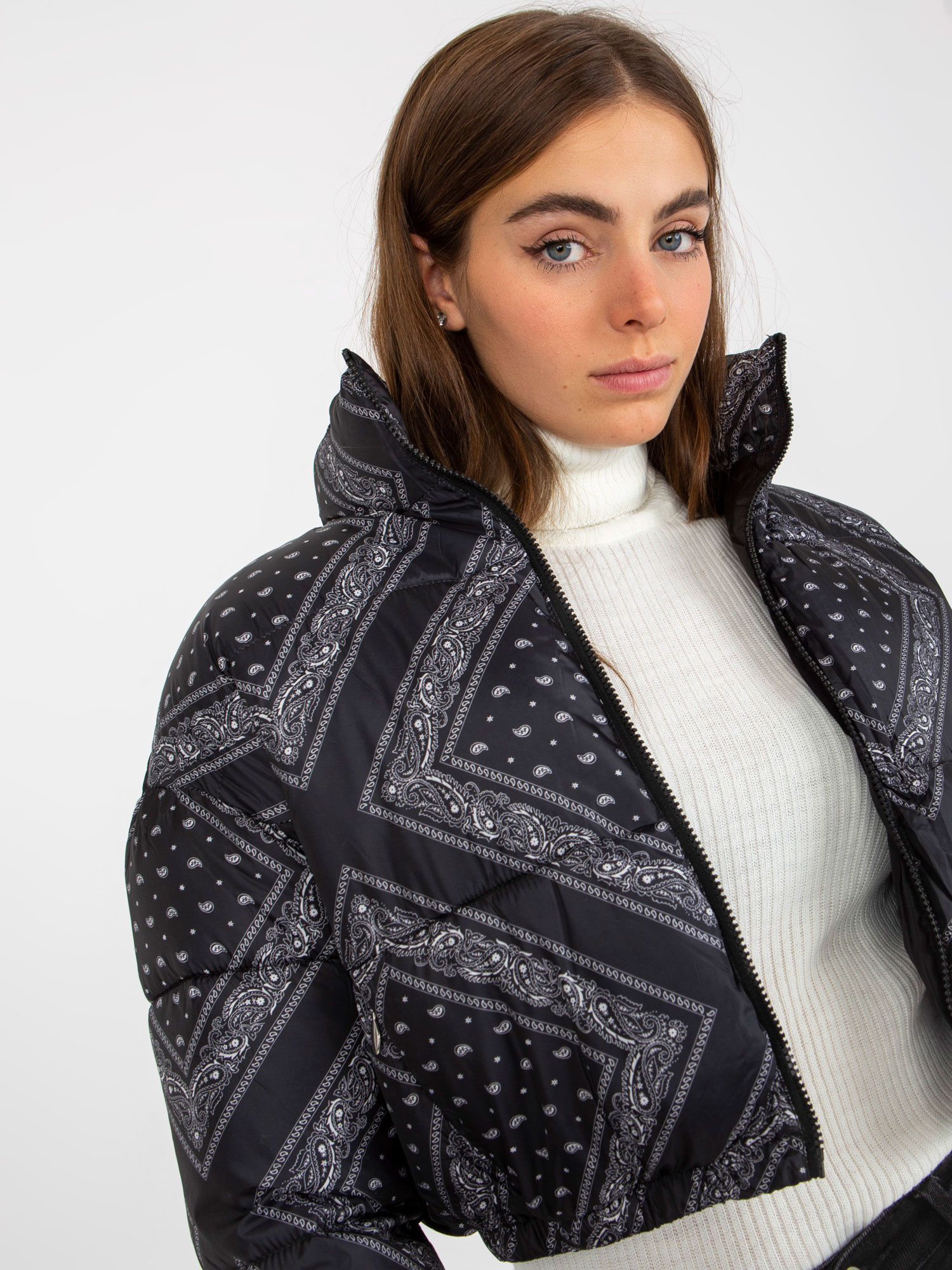Czarna krótka puchowa kurtka pikowana bez kaptura .