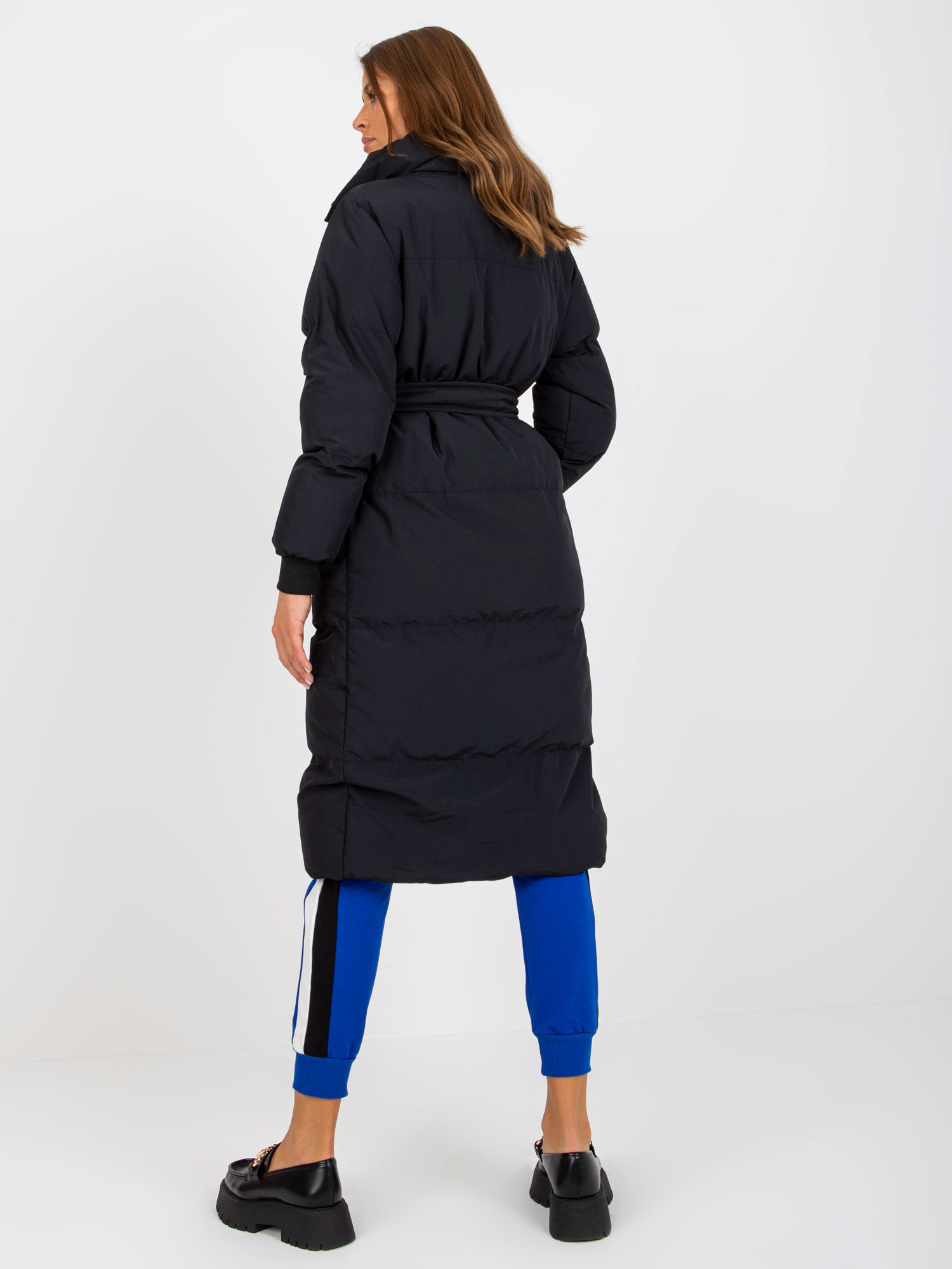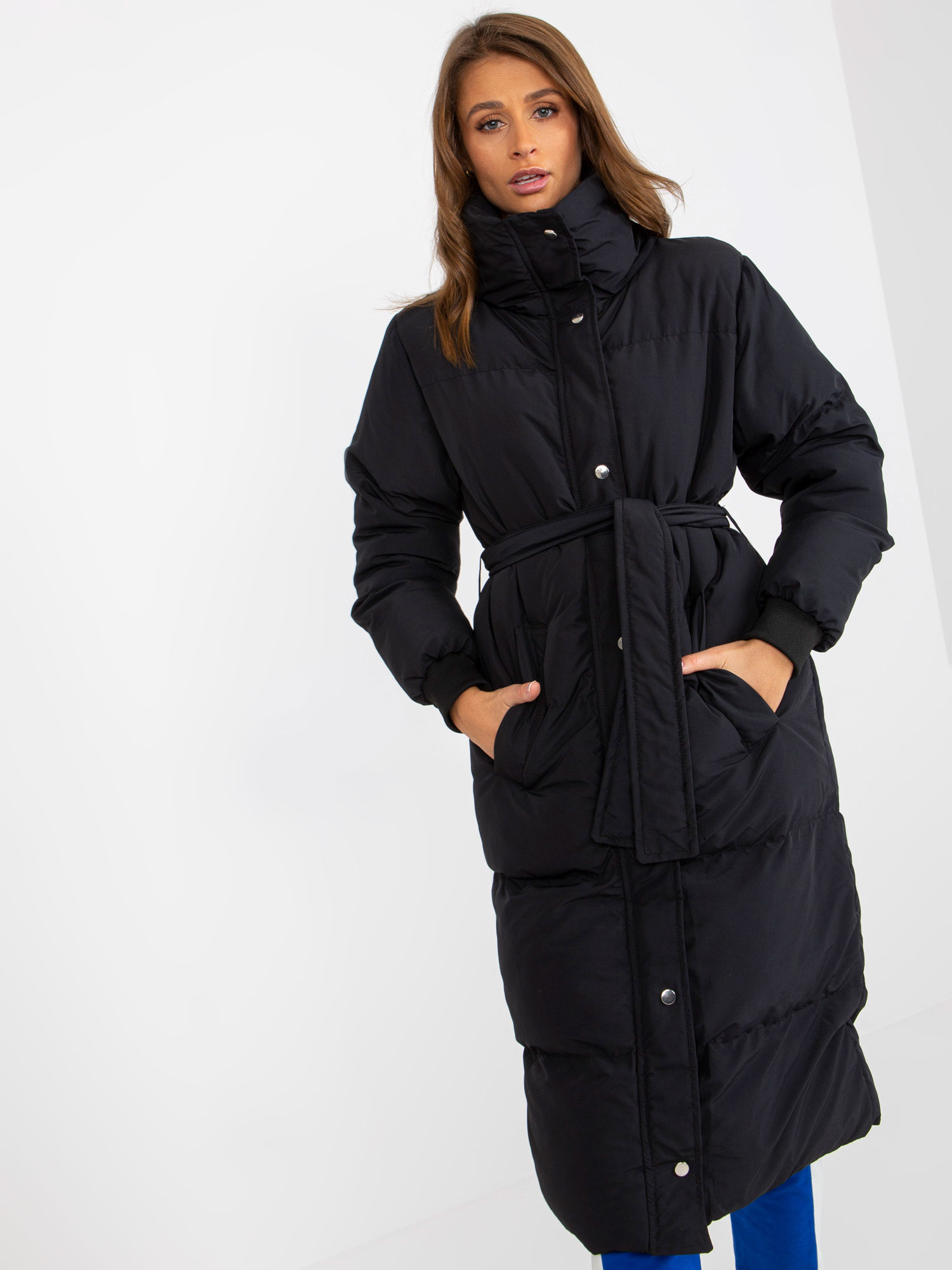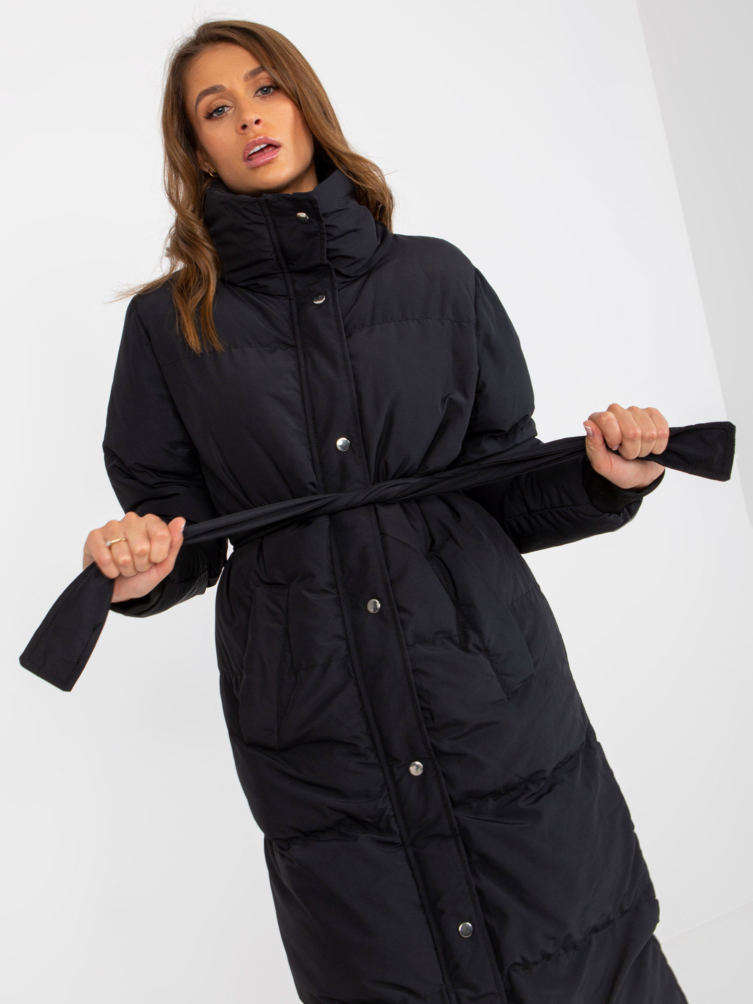Czarna długa pikowana kurtka zimowa z wiązaniem .