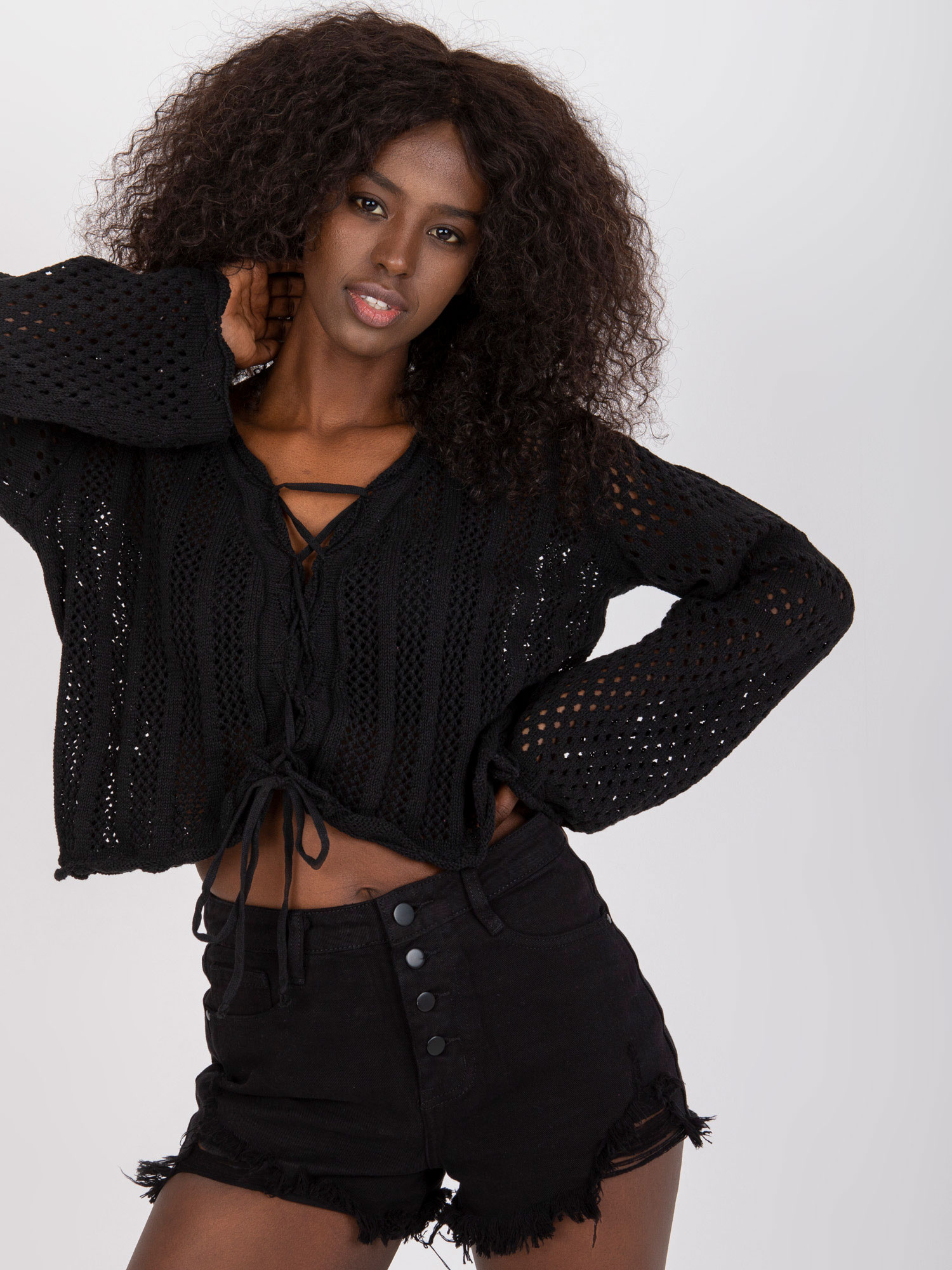 Modelka ma na sobie rozmiar S. Wymiary modelki: wzrost 174 cm, biust 92 cm, talia 62 cm, biodra 90 cm.