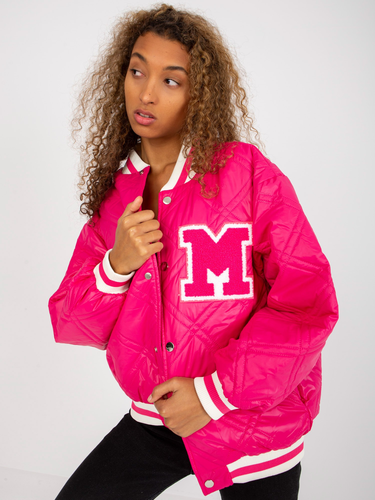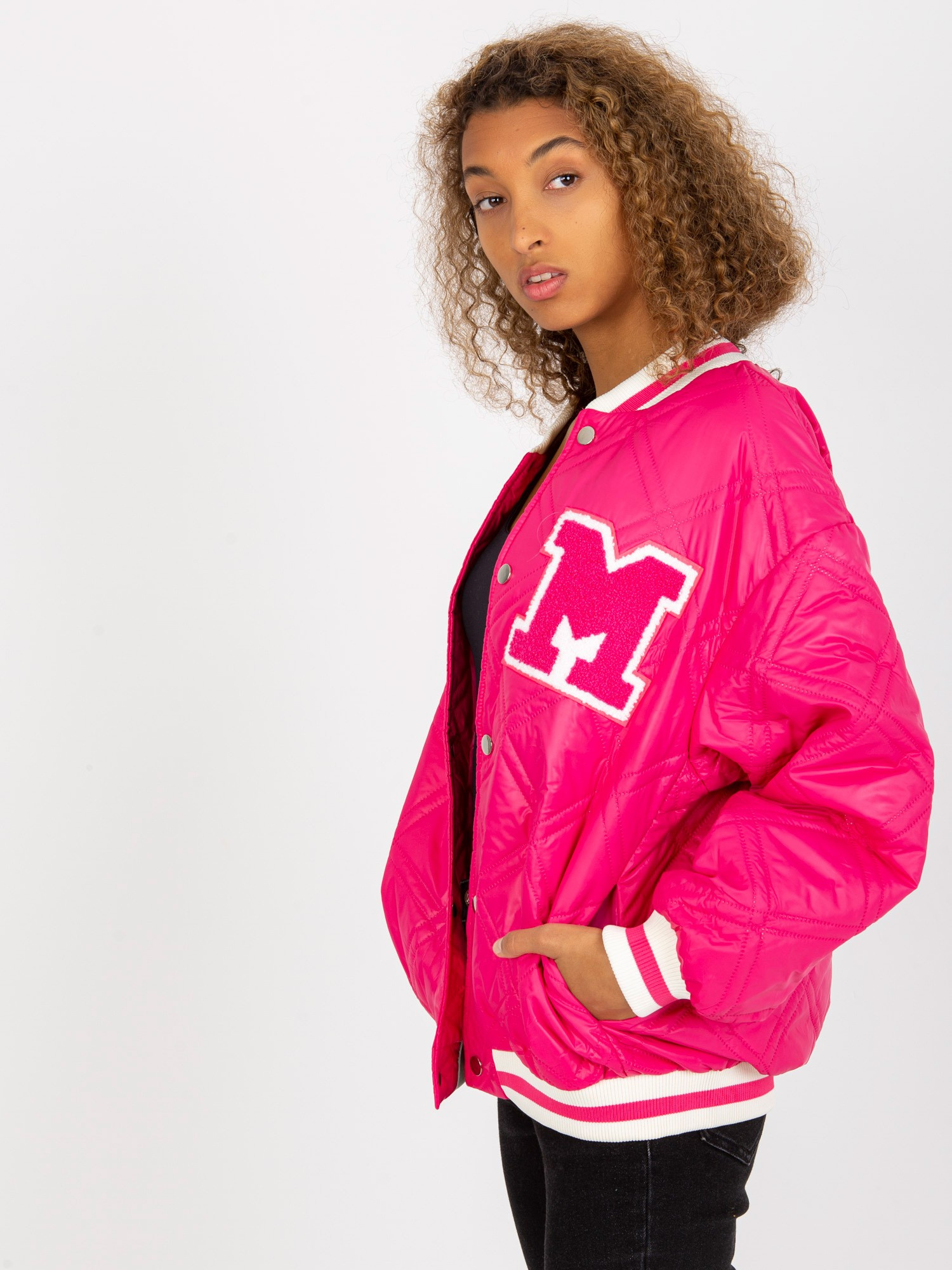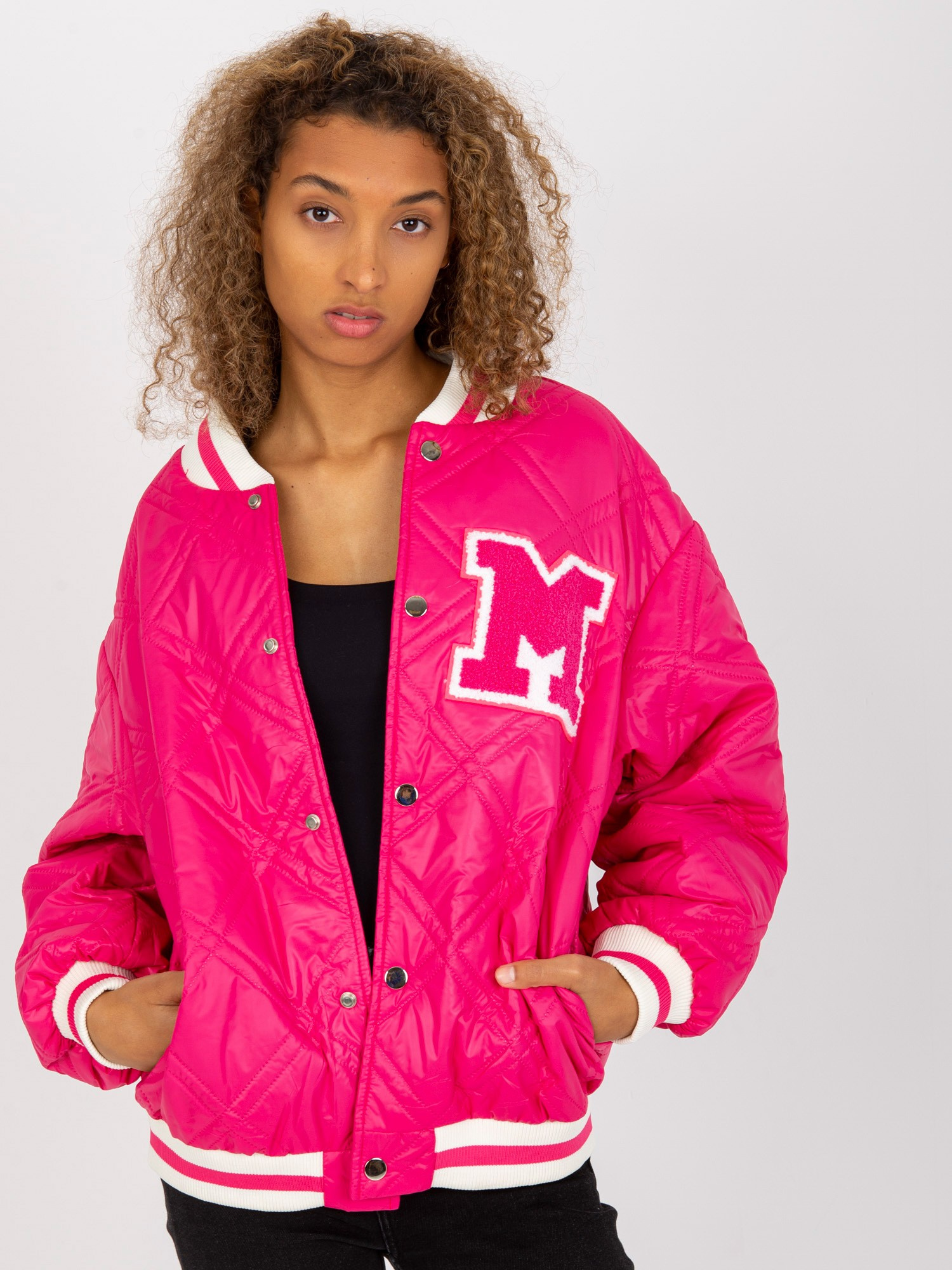 Fuksjowa pikowana kurtka bomber z naszywką .