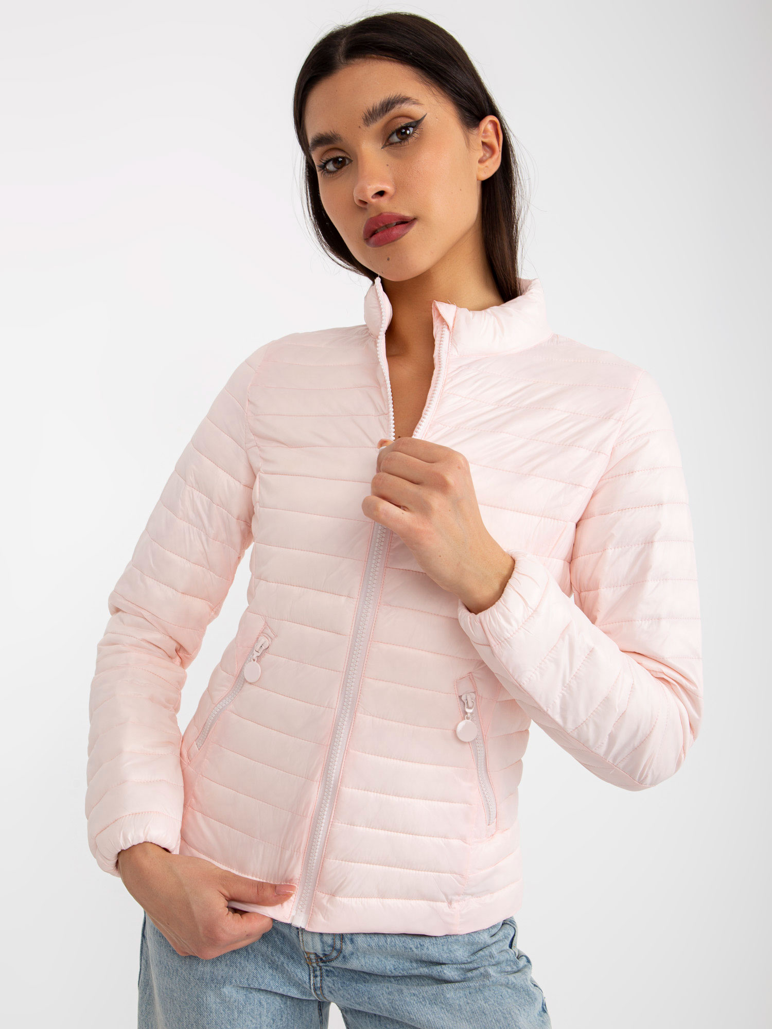 Jasnoróżowa przejściowa kurtka pikowana bez kaptura .