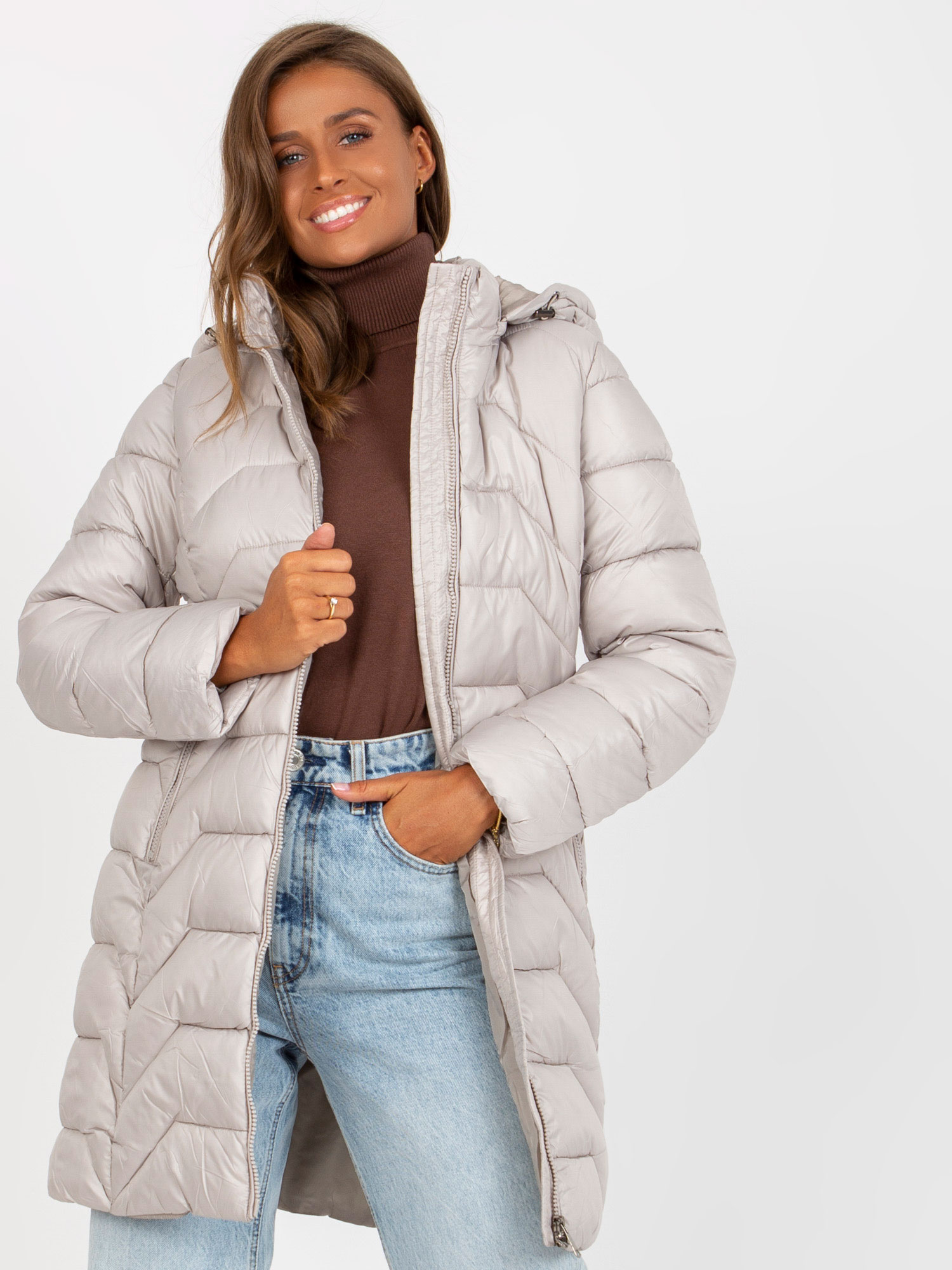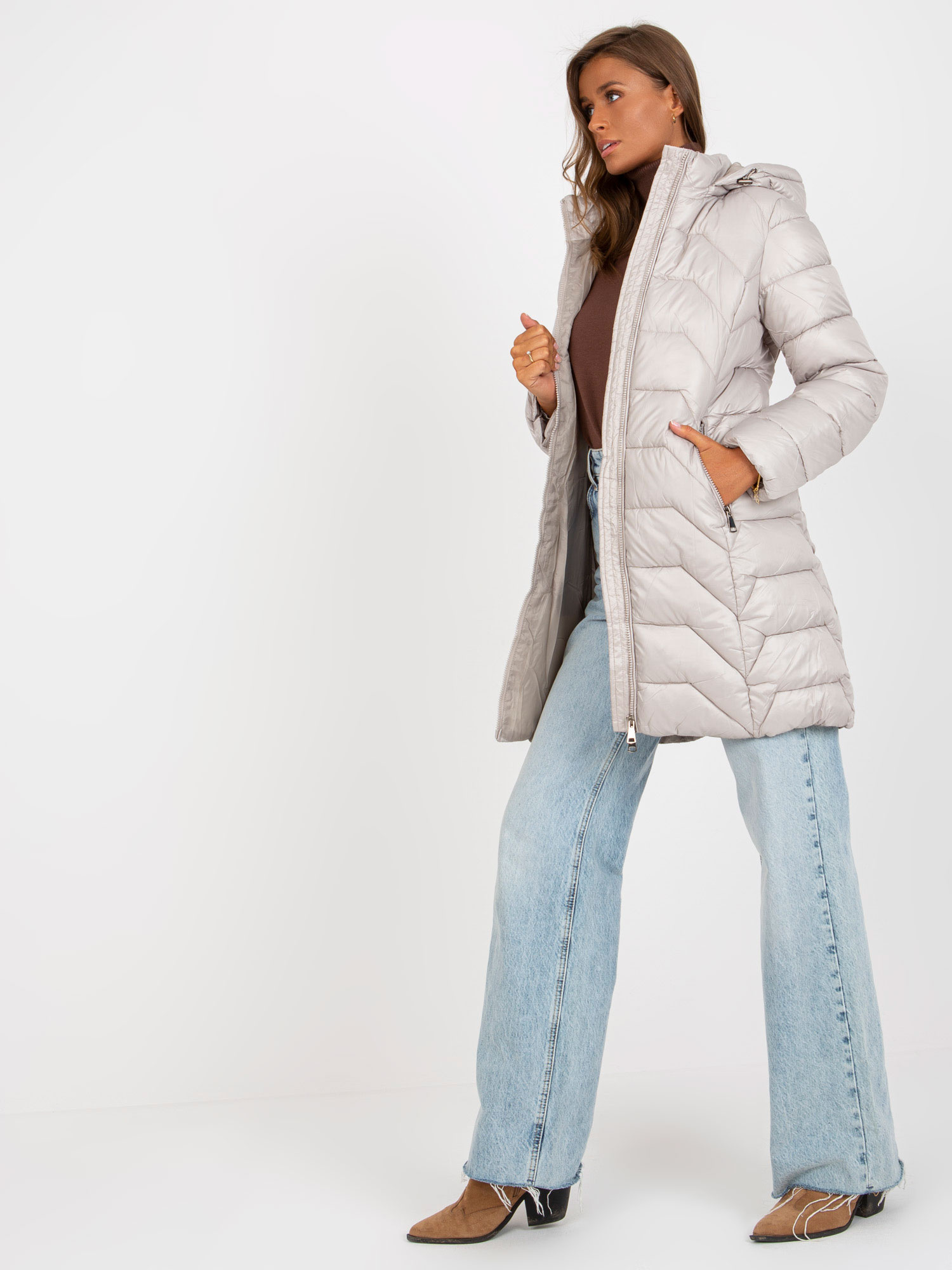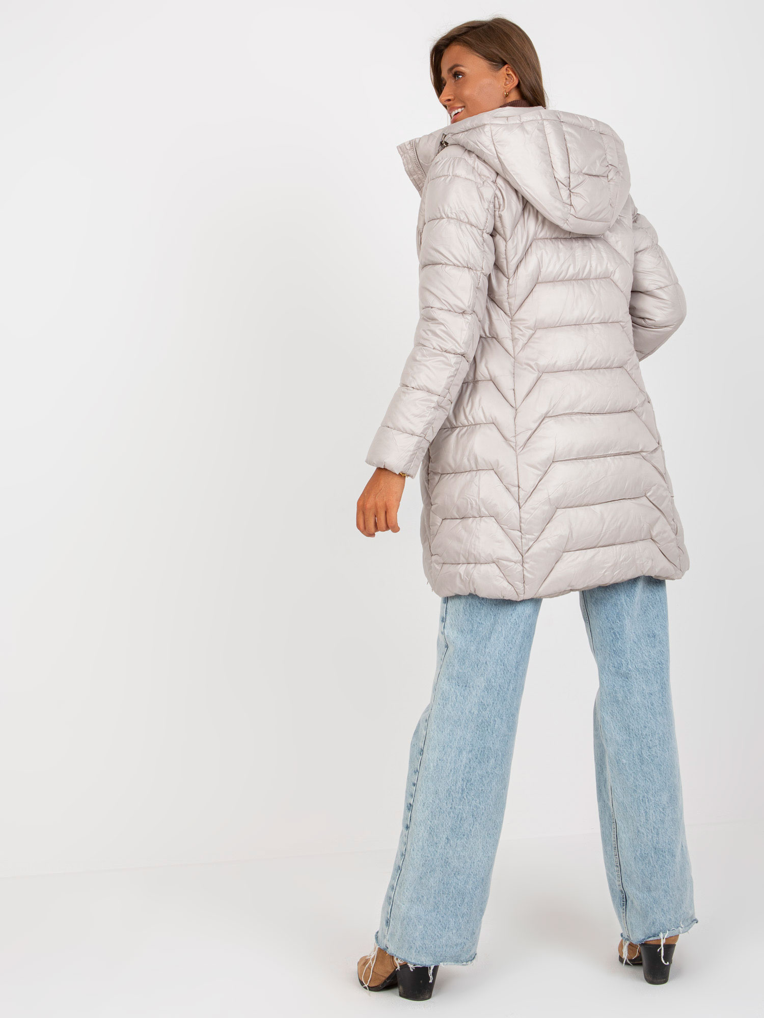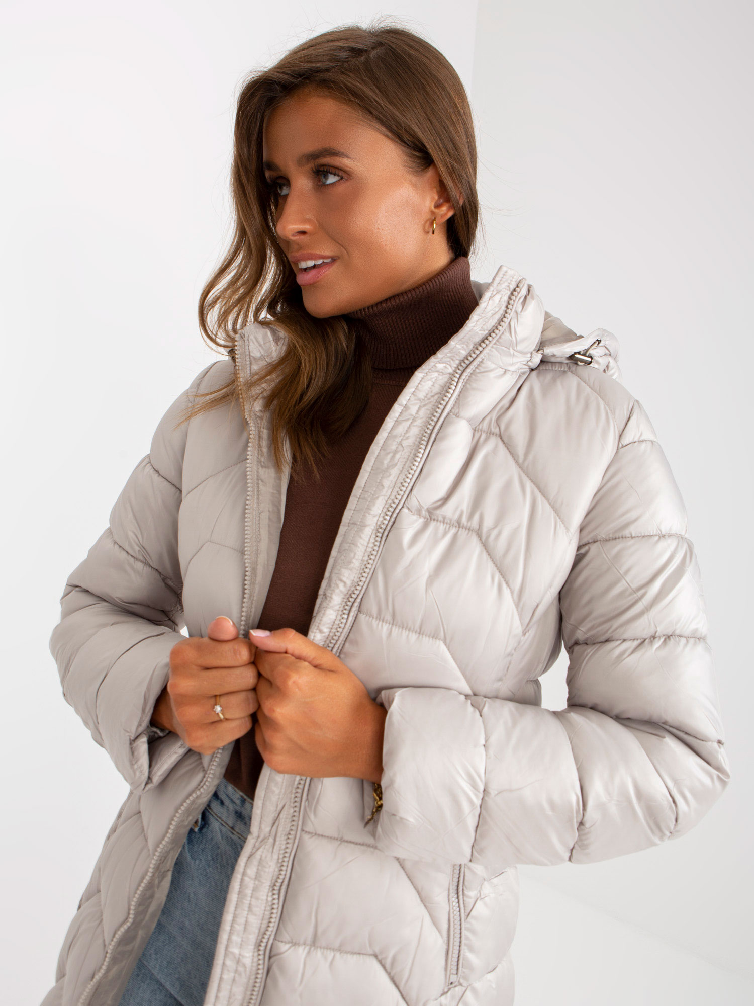 Jasnoszara pikowana kurtka przejściowa z kapturem .