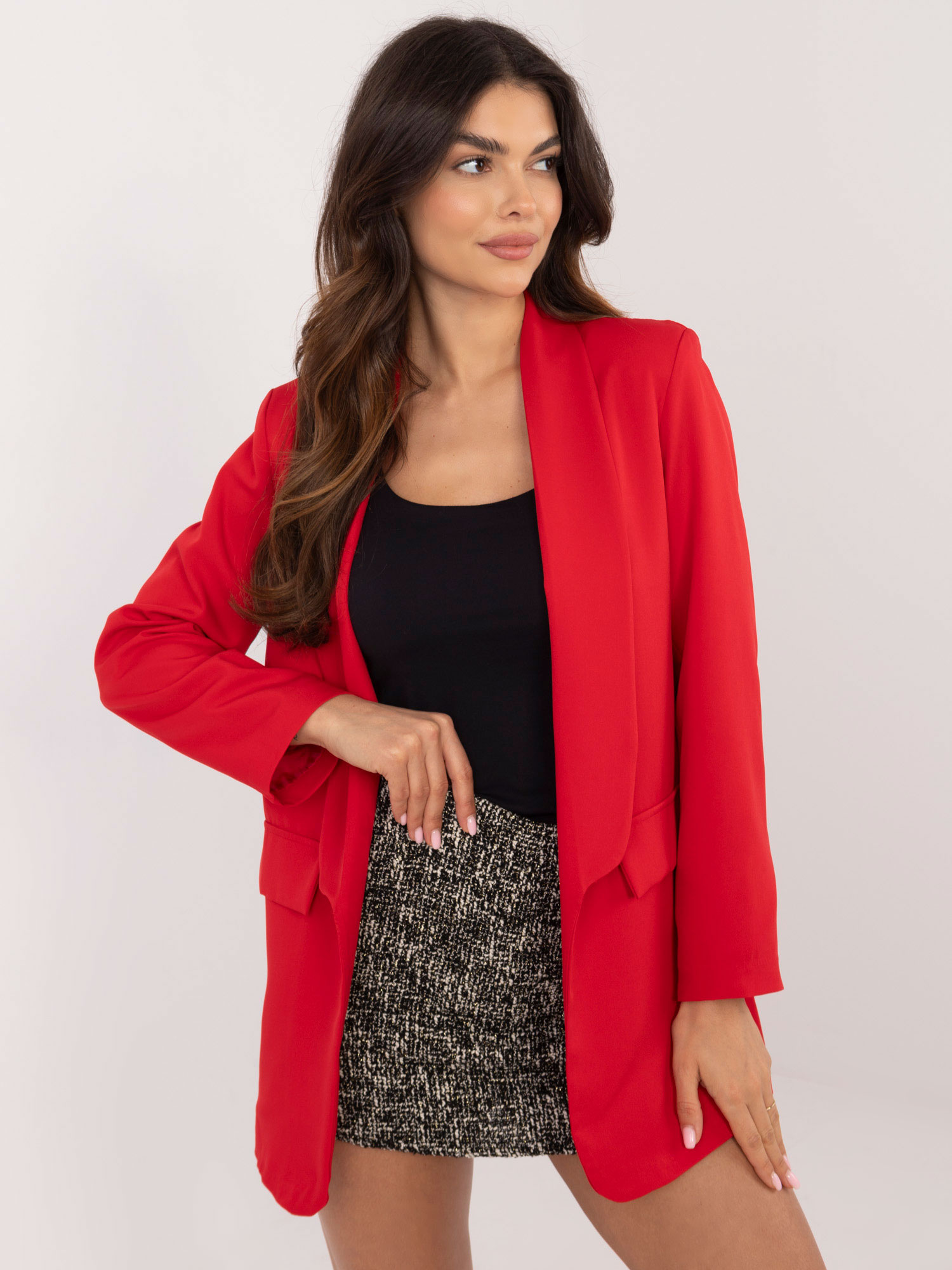 Wymiary marynarki w rozmiarze one size mierzone na płasko: szerokość pod pachami – 54 cm, długość rękawa – 55 cm, długość całkowita – 76 cm.