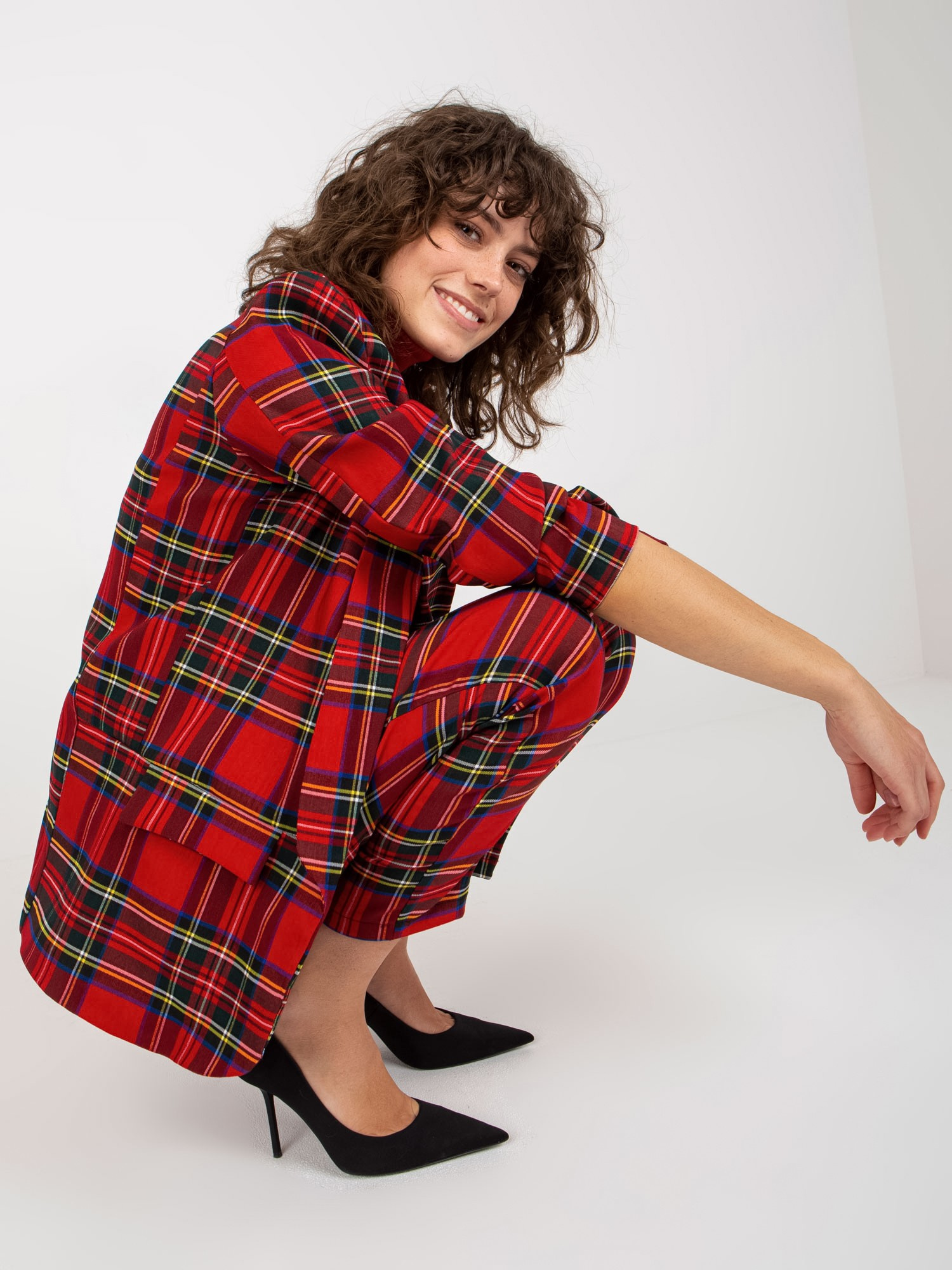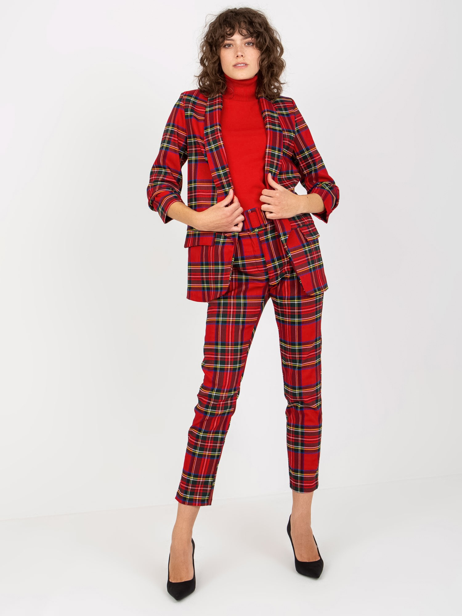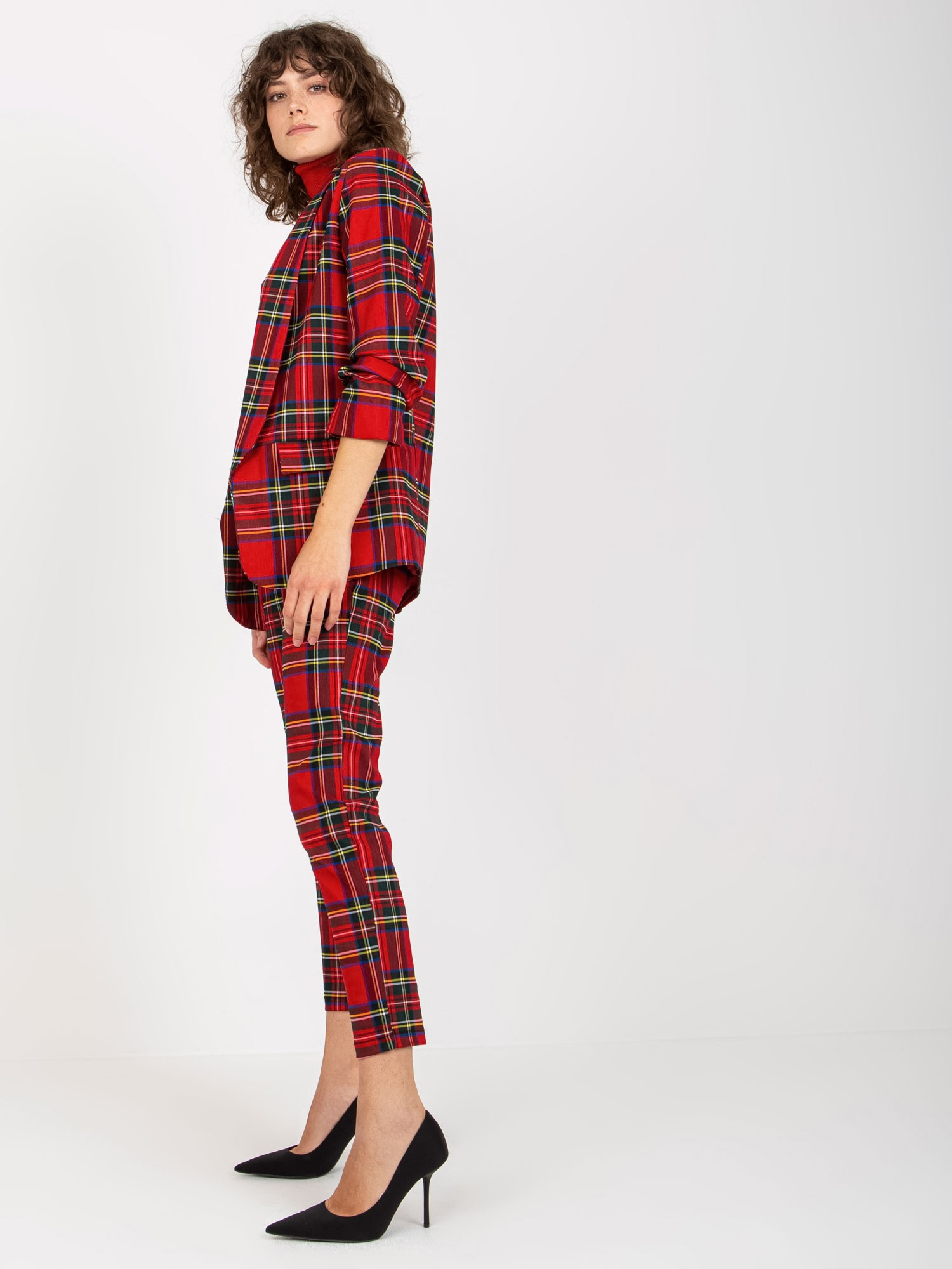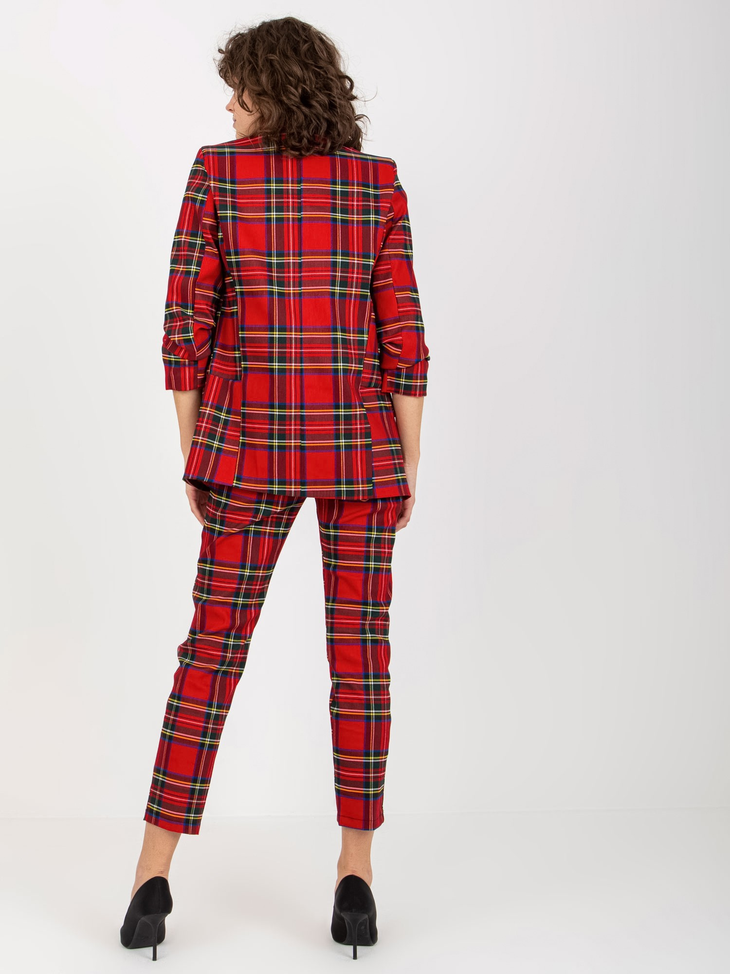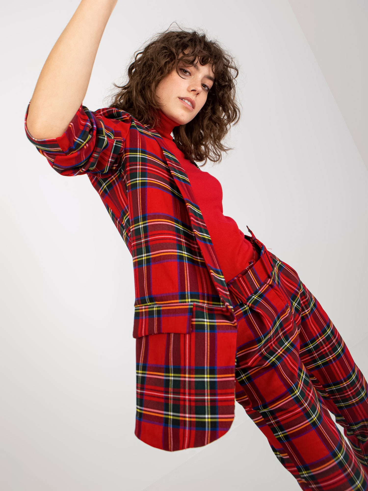 Czerwona marynarka w kratę od garnituru z rękawem 3/4 .