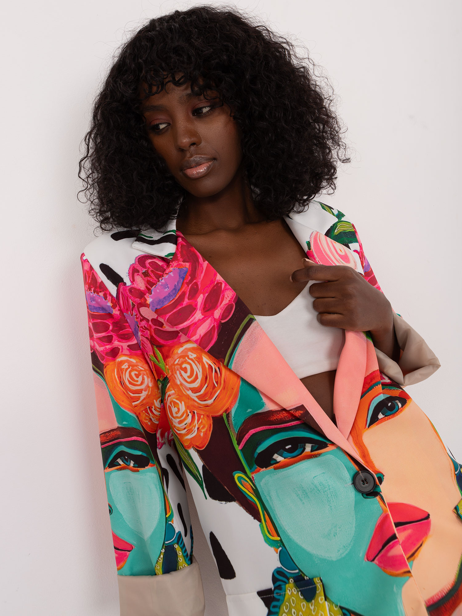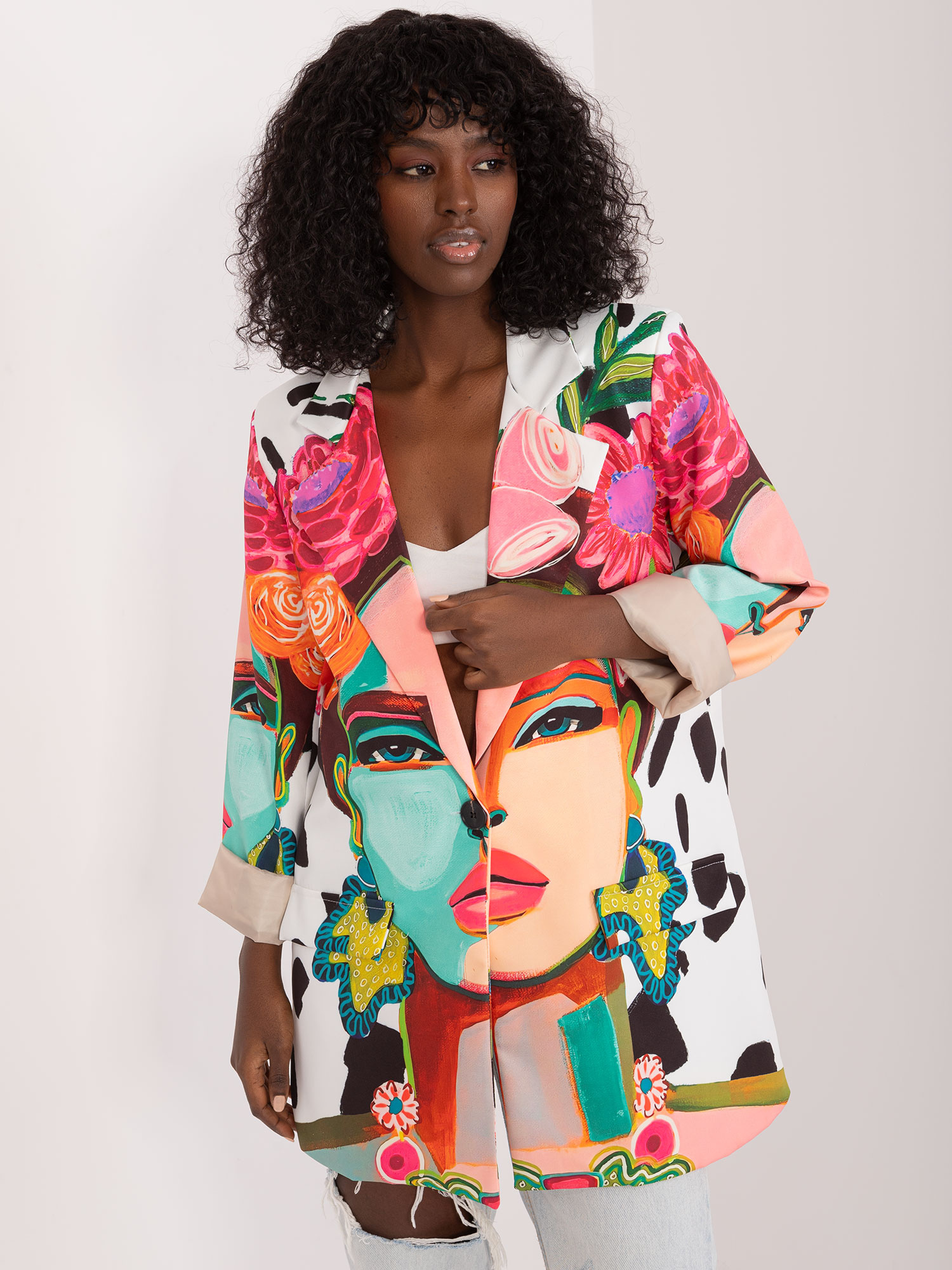 Wymiary marynarki w rozmiarze one size mierzone na płasko: szerokość pod pachami – 55 cm, długość rękawa – 60 cm, długość całkowita – 79 cm