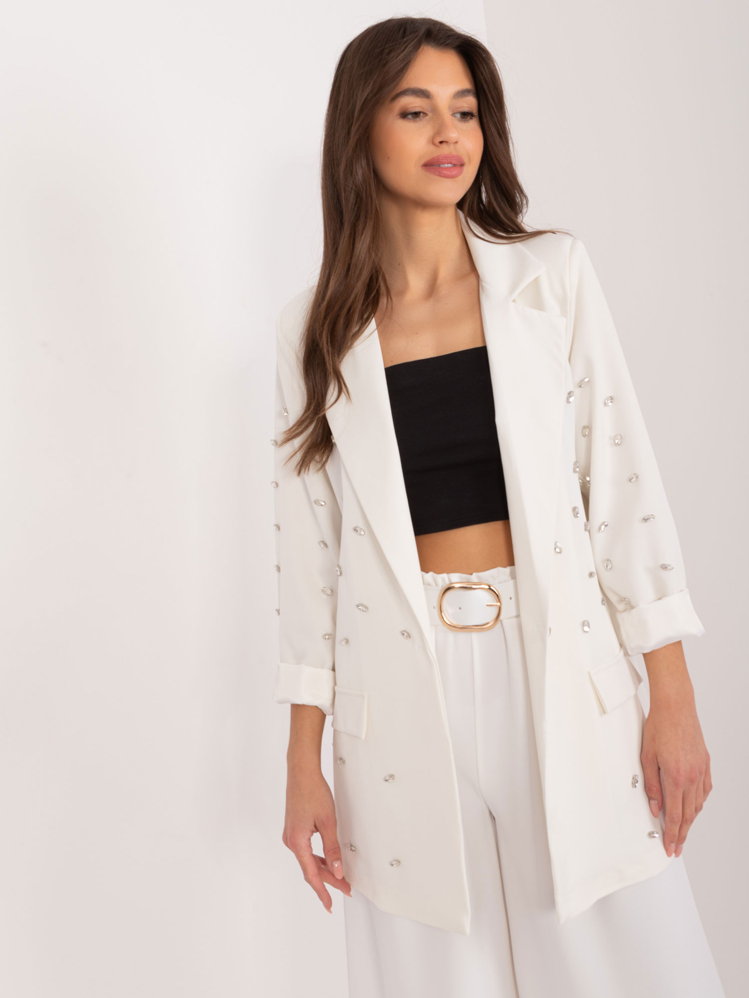Wymiary marynarki w rozmiarze one size mierzone na płasko: szerokość pod pachami – 50 cm, długość rękawa – 57 cm, długość całkowita – 75 cm
