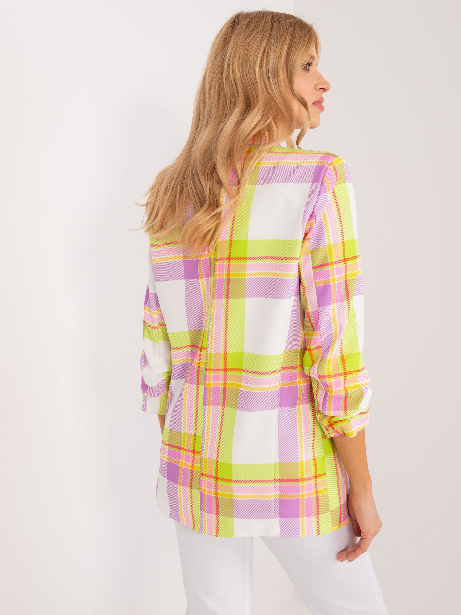 Wymiary marynarki w rozmiarze one size mierzone na płasko: szerokość pod pachami – 54 cm, długość rękawa – 45 cm, długość całkowita – 73 cm.