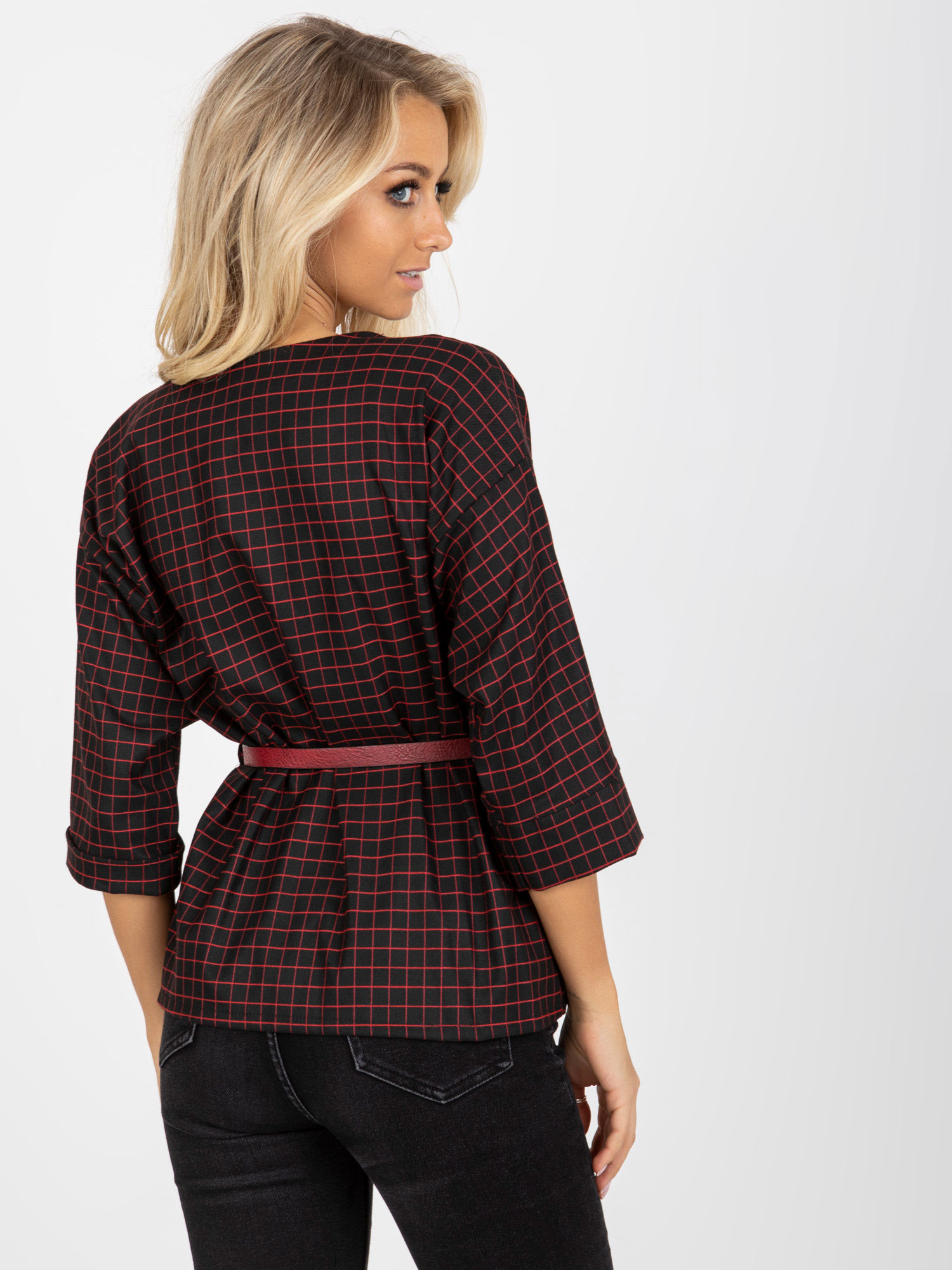 Czarno-czerwona elegancka narzutka z paskiem .