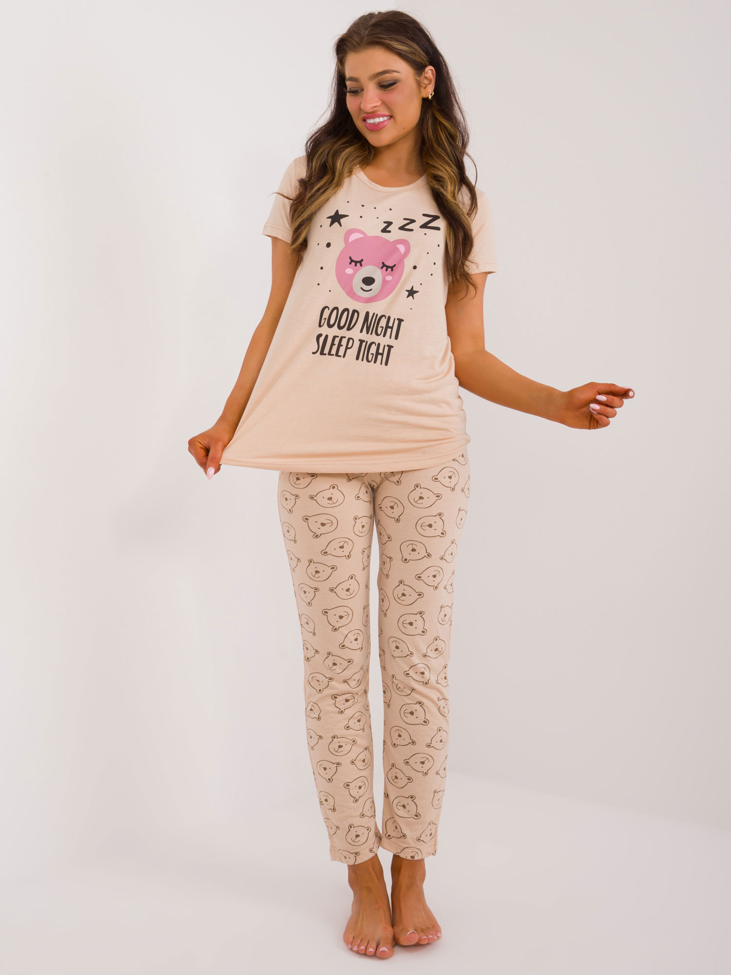 Wymiary piżamy w rozmiarze S mierzone na płasko: t-shirt: szerokość pod pachami – 50 cm, długość całkowita – 70 cm, spodnie: szerokość w pasie – 32 cm, długość całkowita – 98 cm.
