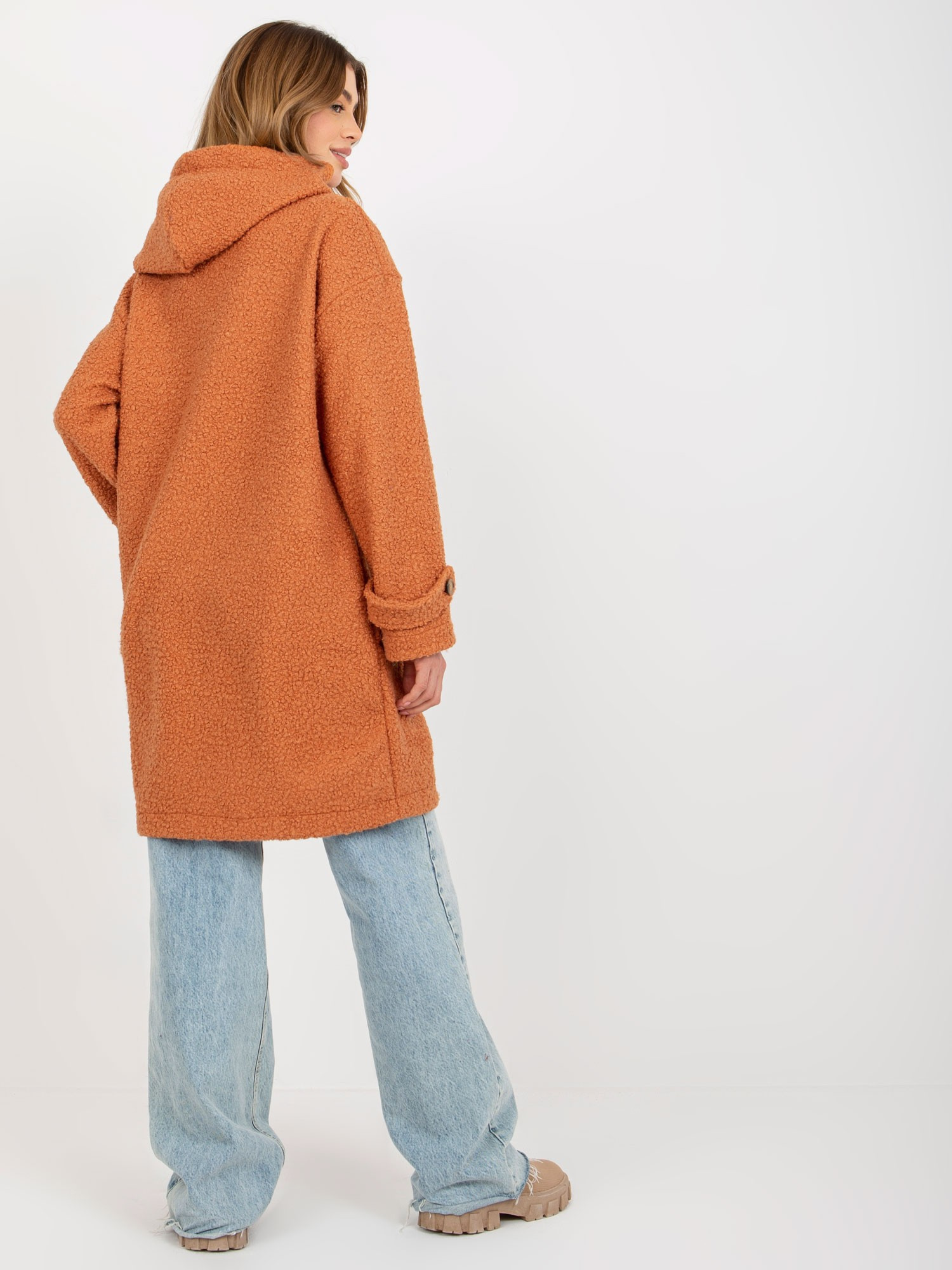Ciemnopomarańczowy pluszowy płaszcz damski z kapturem .
