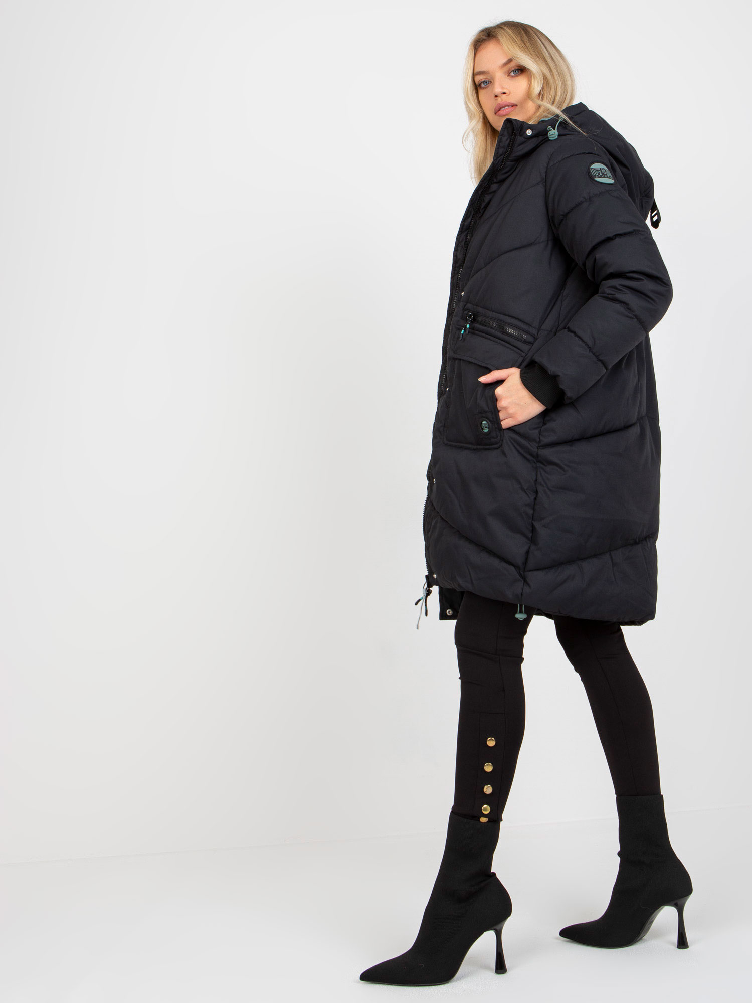 Czarna długa damska kurtka zimowa z kapturem FRESH MADE .
