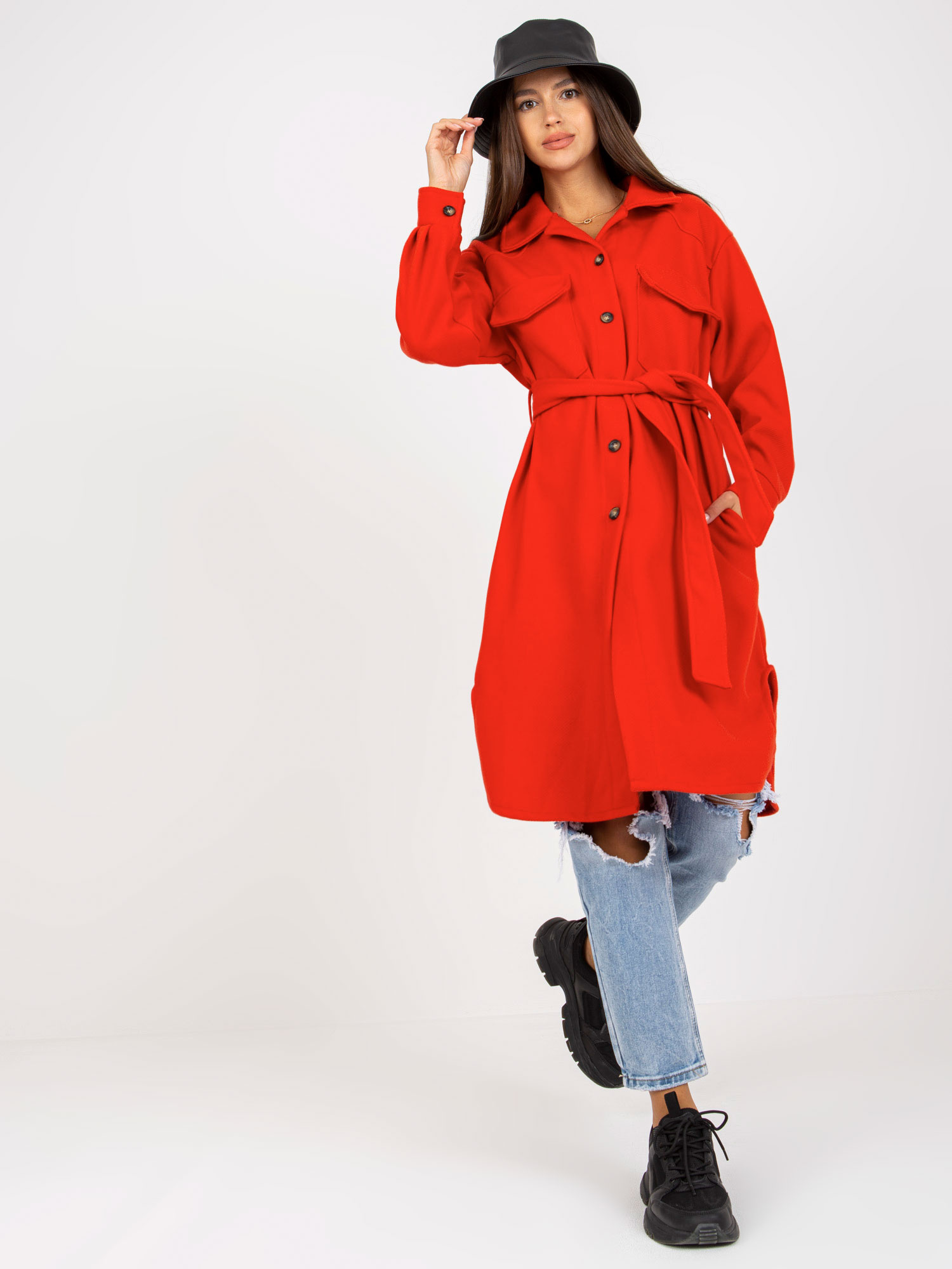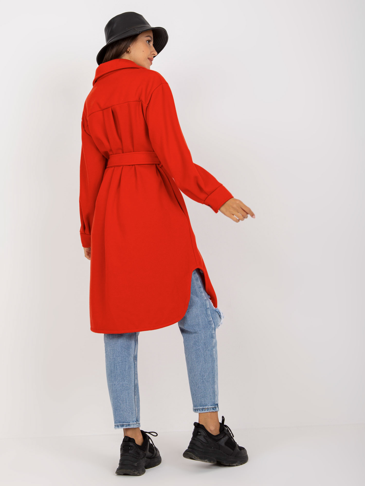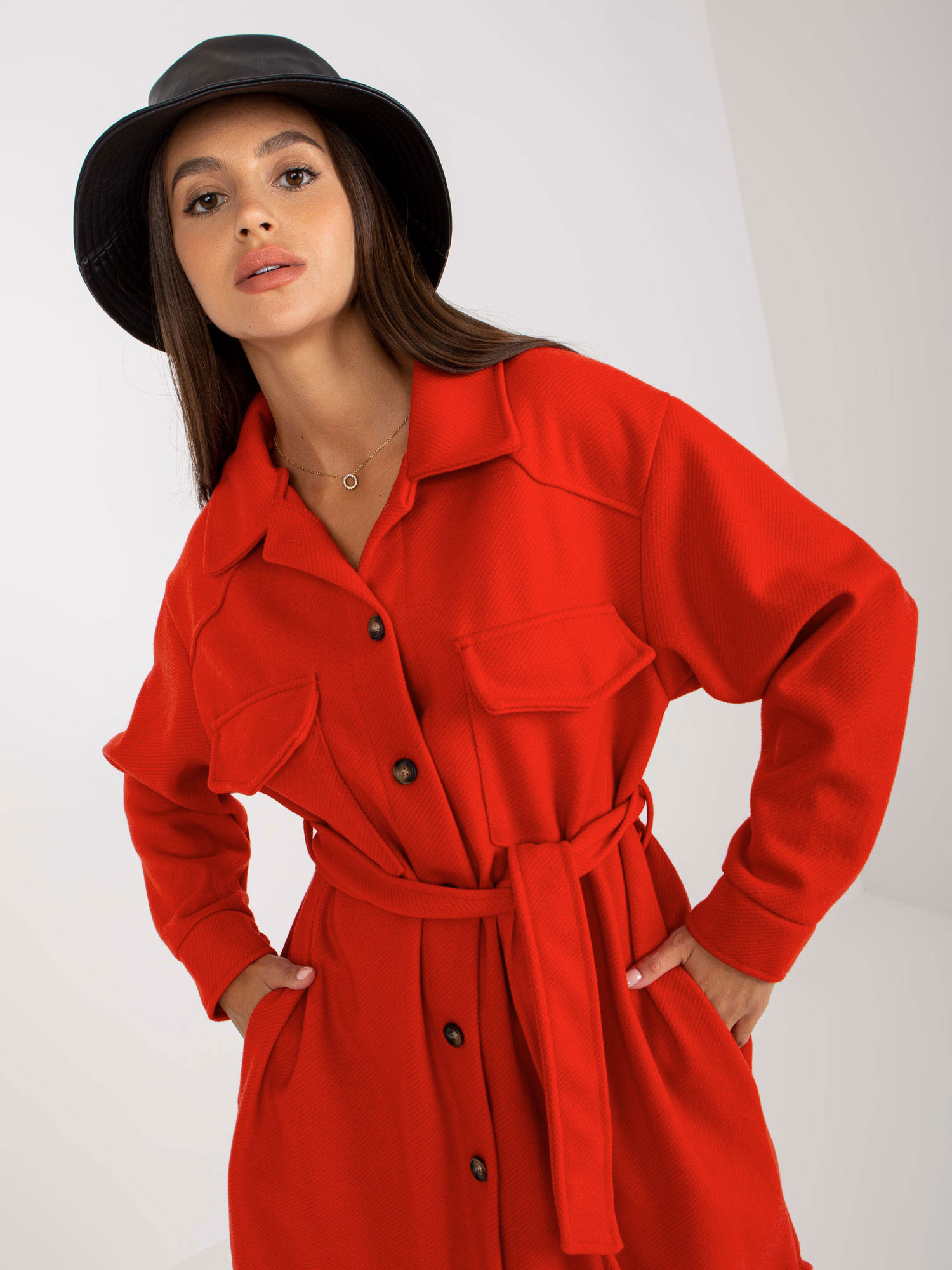 Czerwona długa koszula wierzchnia z paskiem.