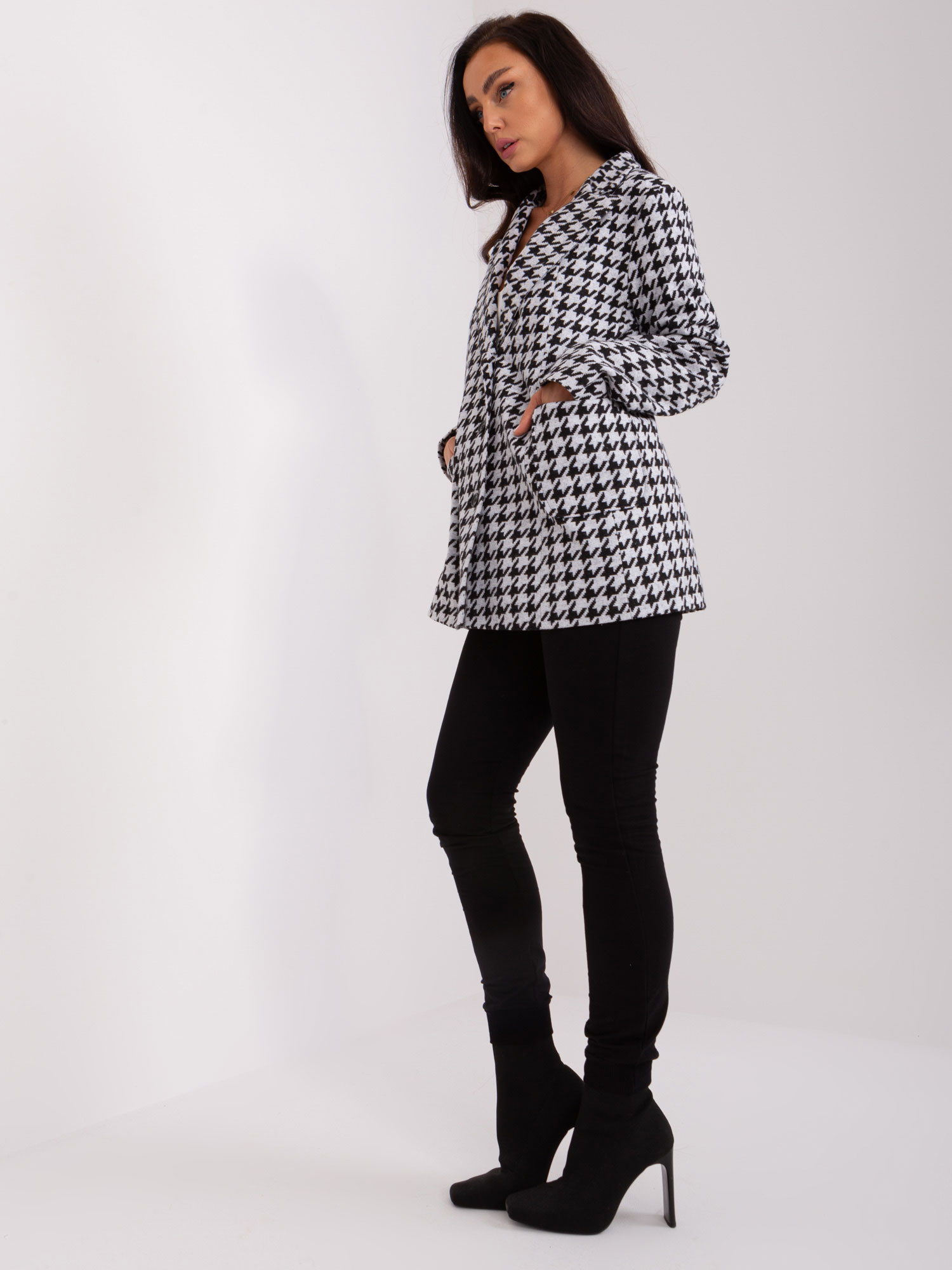 Szaro-czarny damski płaszcz w pepitkę .