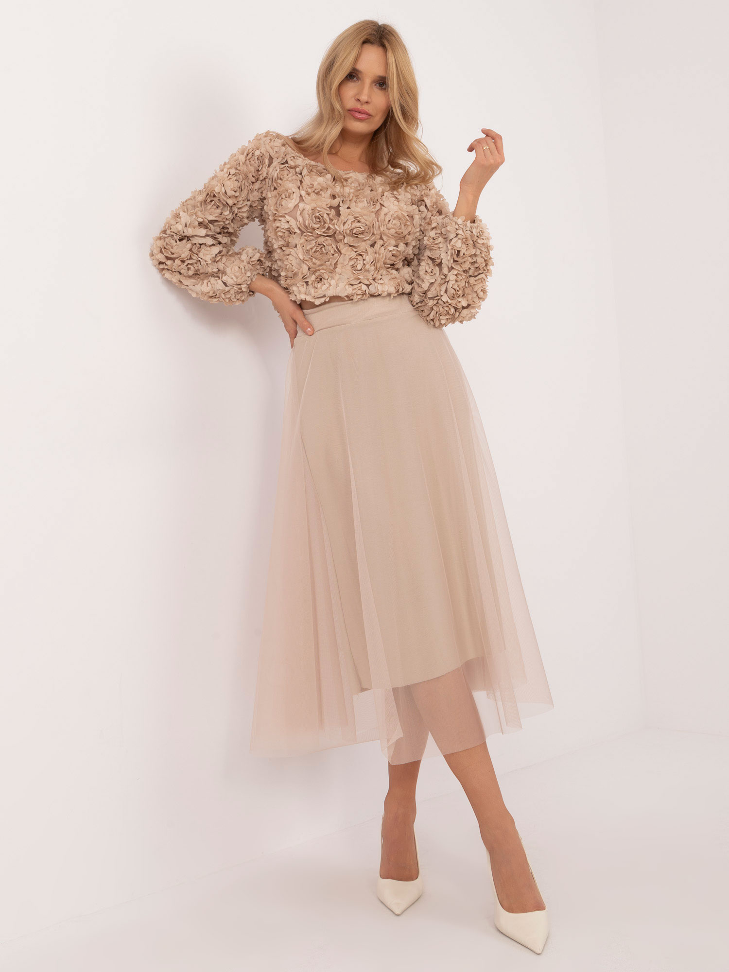 Wymiary spódnicy w rozmiarze one size mierzone: szerokość w pasie – 34 cm (na płasko), szerokość w pasie – 52 cm (po rozciągnięciu), długość całkowita – 84 cm.