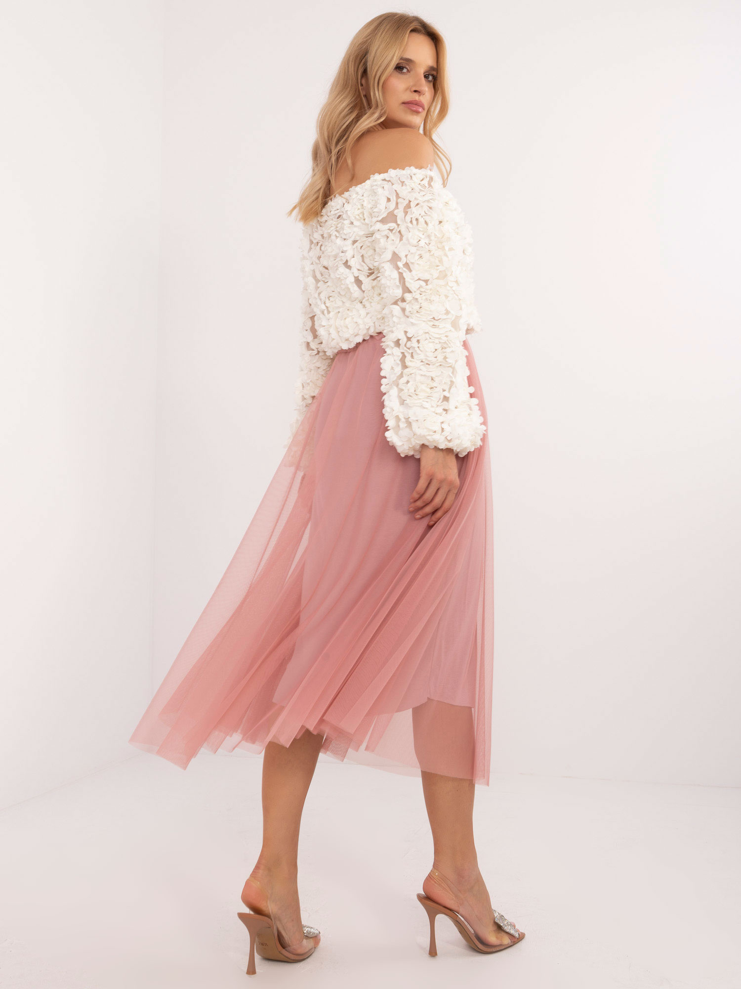 Wymiary spódnicy w rozmiarze one size mierzone: szerokość w pasie – 34 cm (na płasko), szerokość w pasie – 52 cm (po rozciągnięciu), długość całkowita – 84 cm.