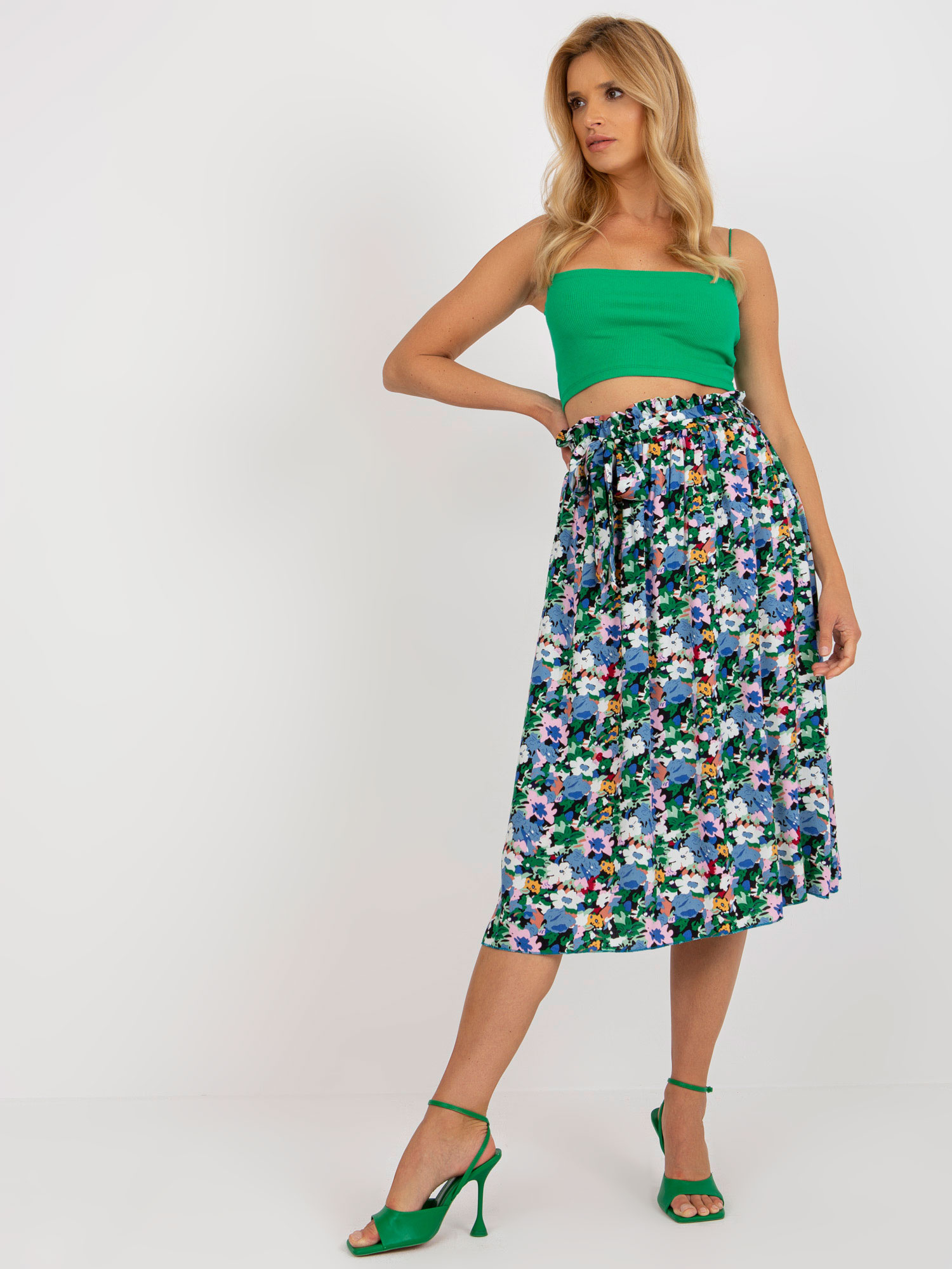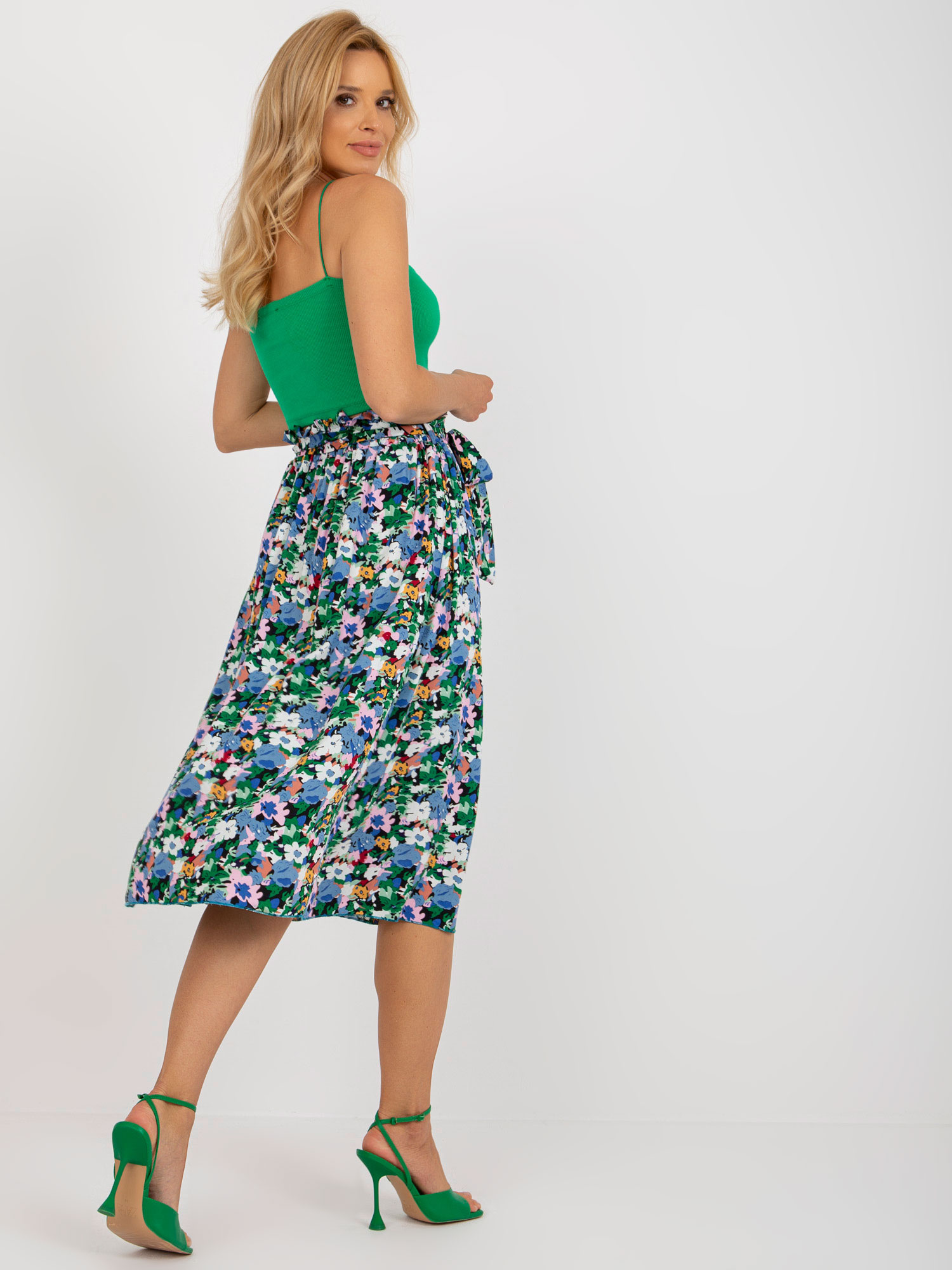 Wymiary spódnicy w rozmiarze S/M mierzone na płasko: szerokość w pasie – 34 cm, długość całkowita – 80 cm.