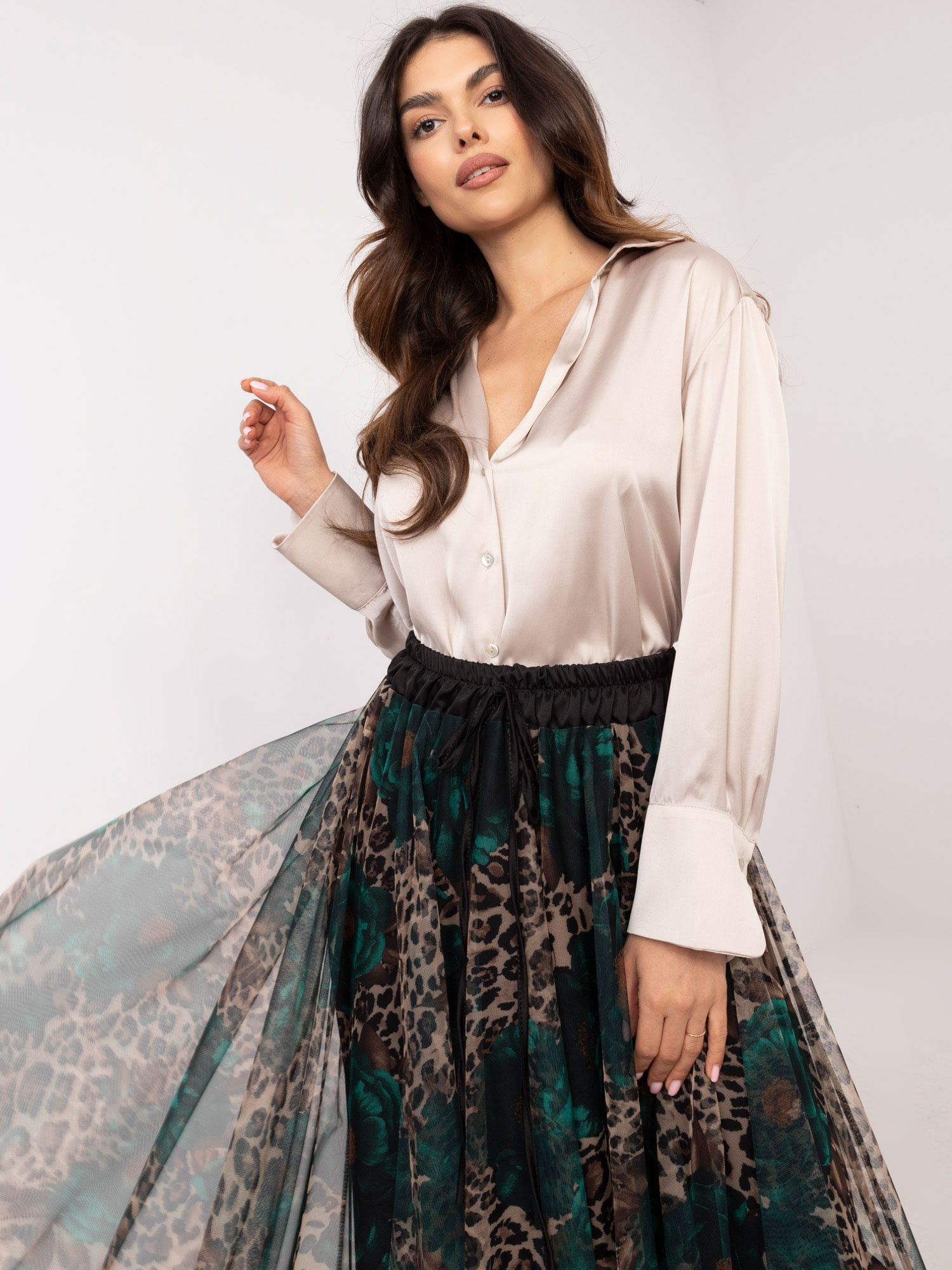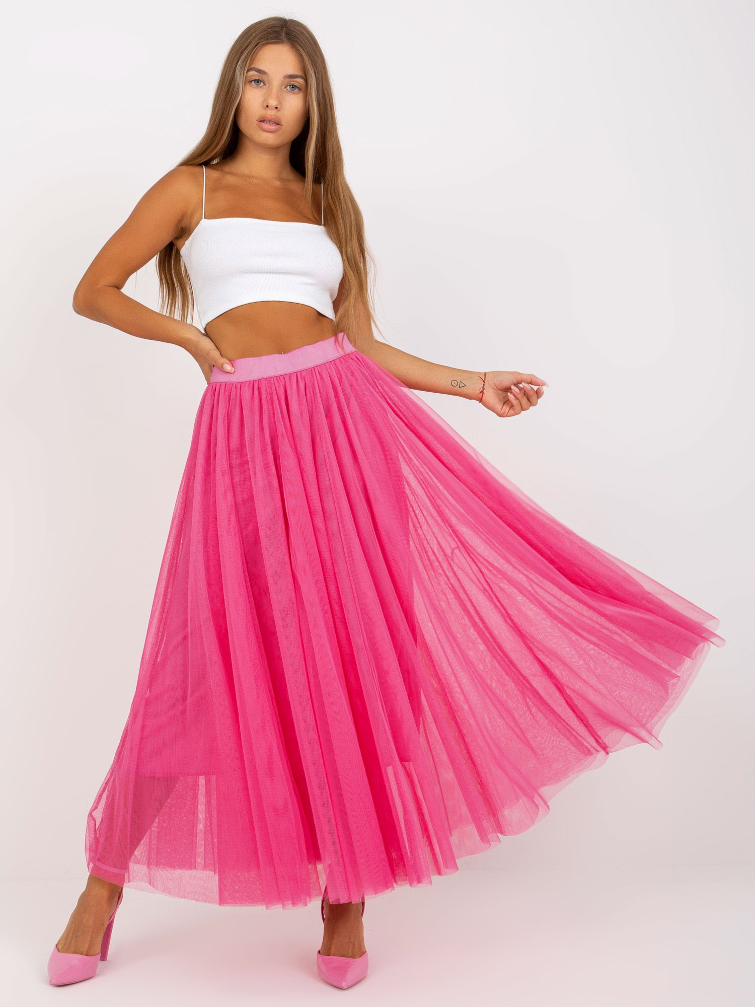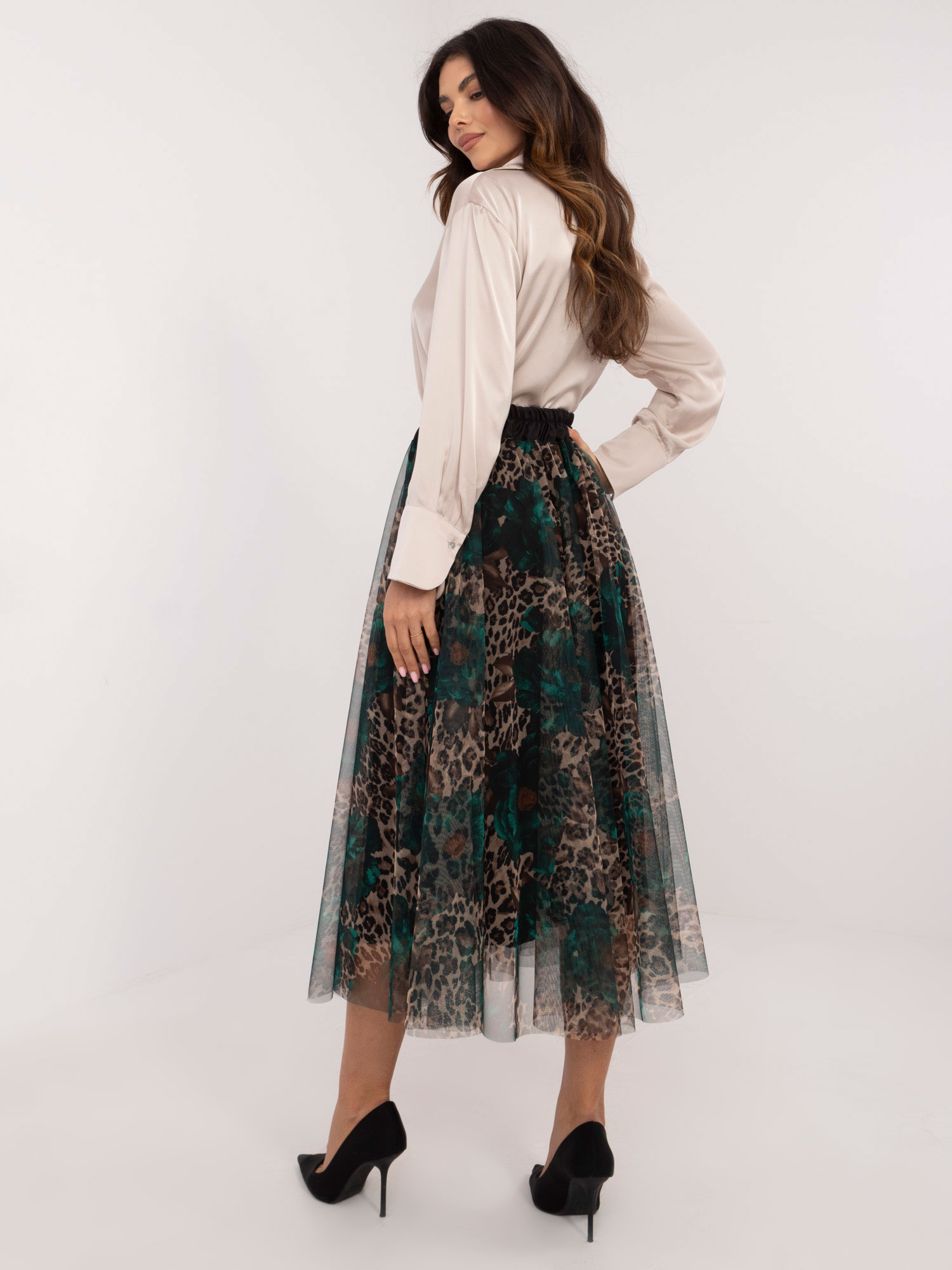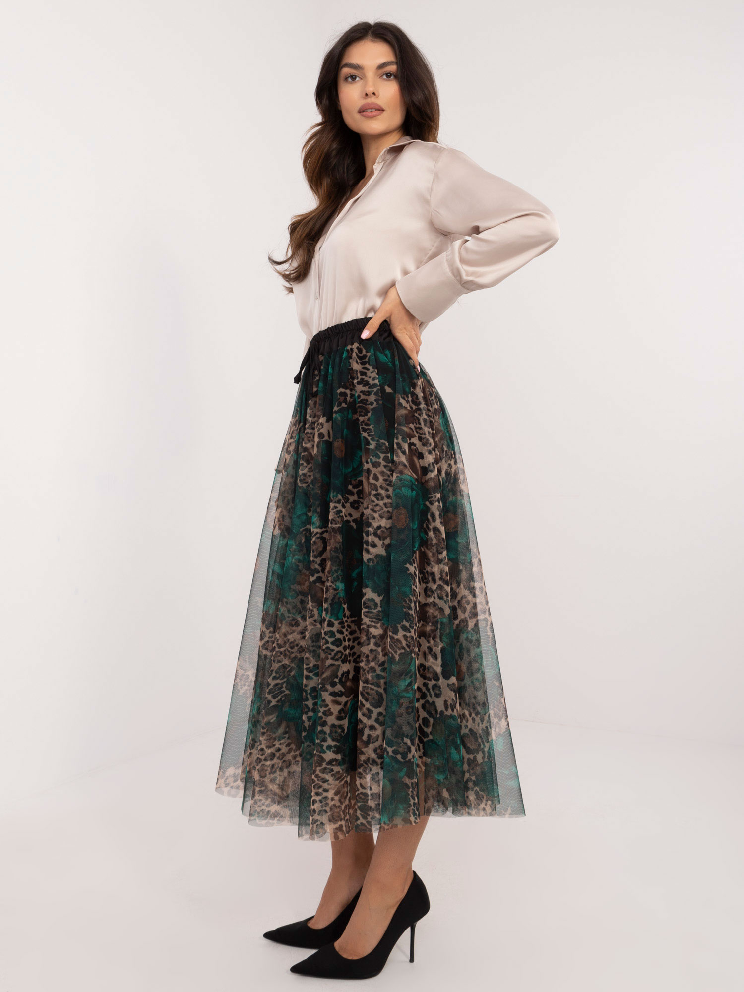 Wymiary spódnicy w rozmiarze one size mierzone: szerokość w pasie (na płasko) – 35 cm, szerokość w pasie (po rozciągnięciu) – 50 cm, długość całkowita – 93 cm.