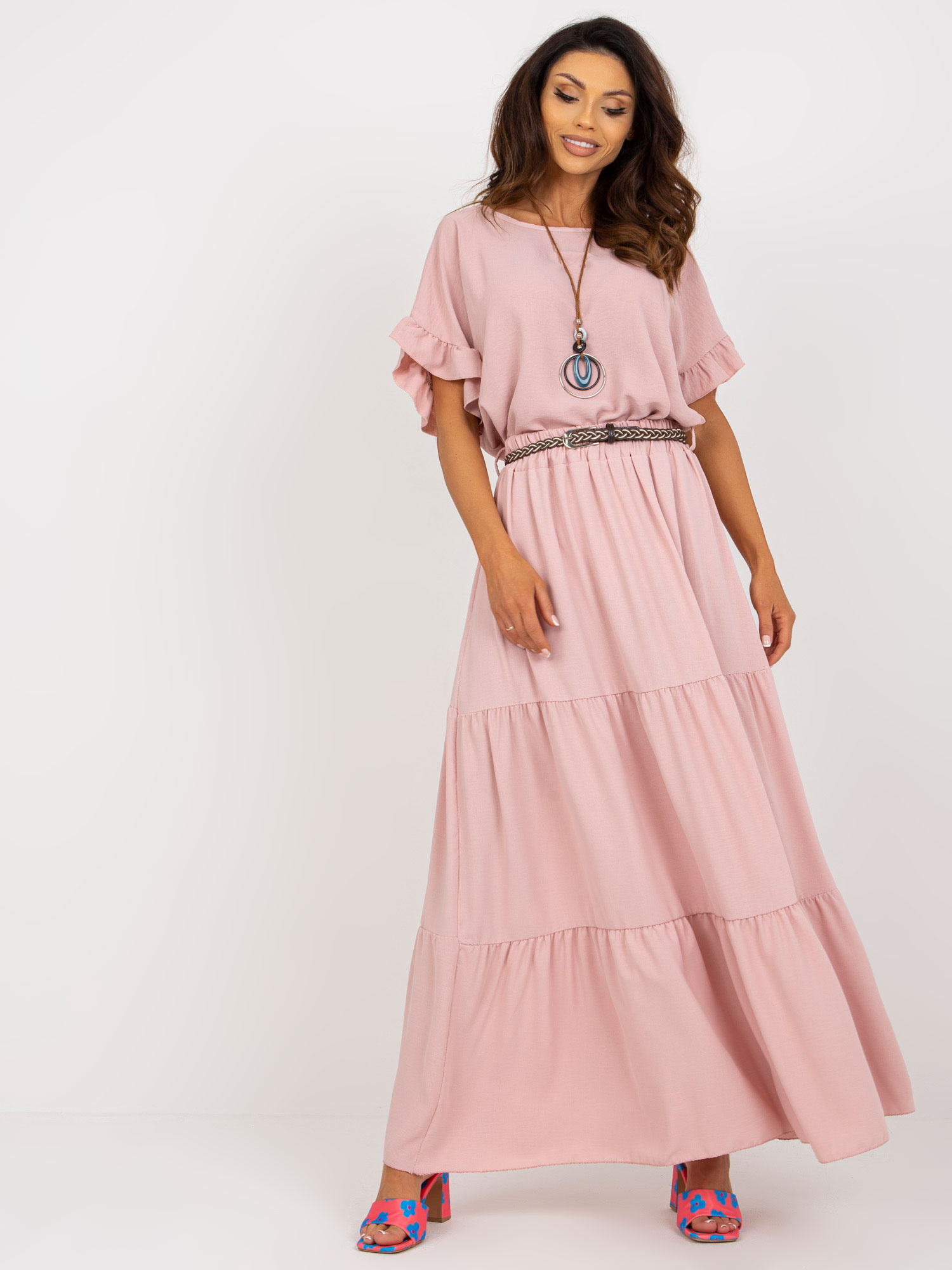 Jasnoróżowa maxi spódnica z falbaną i paskiem .