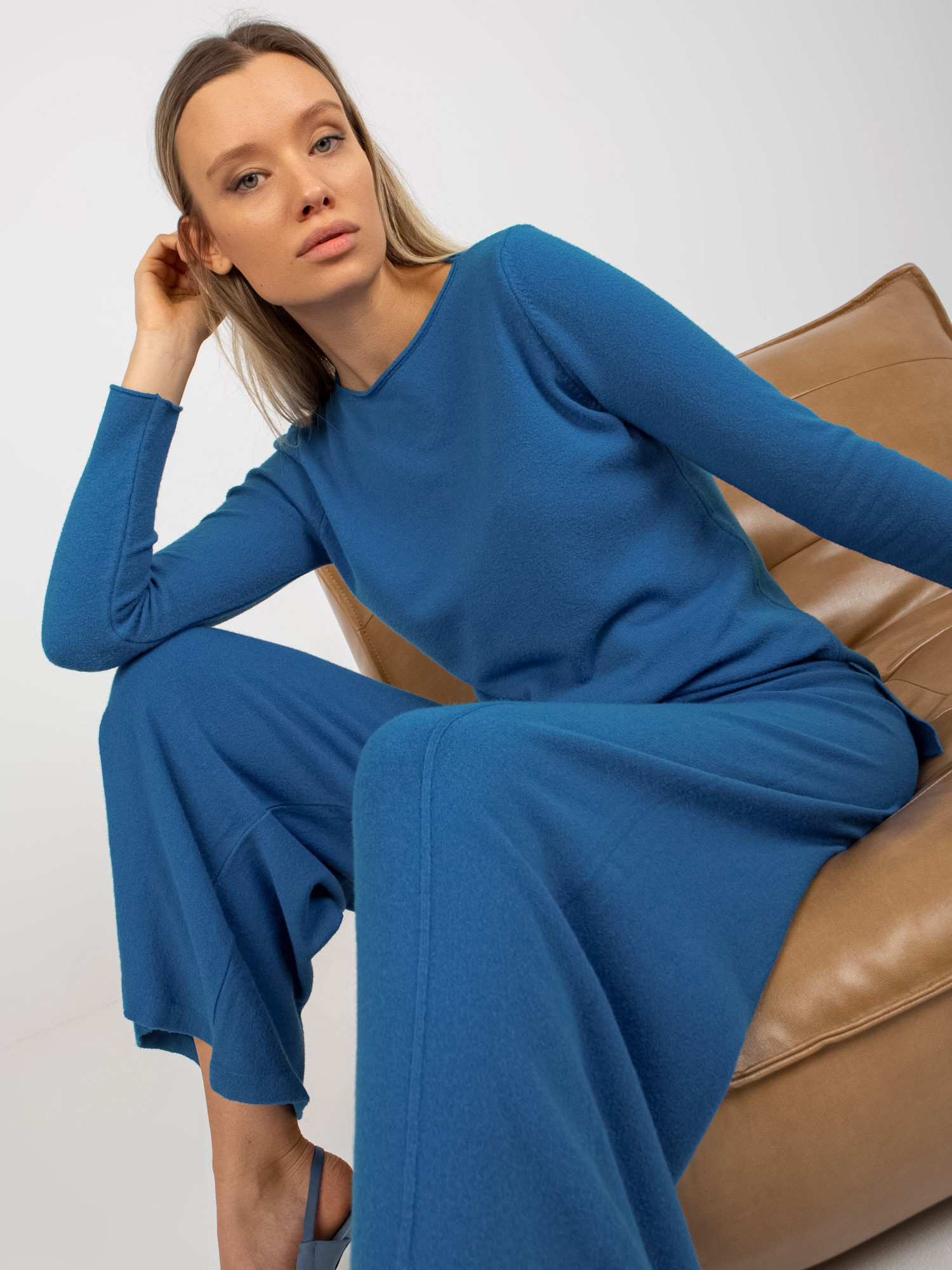 Ciemnoniebieskie spodnie dzianinowe z szeroką nogawką .