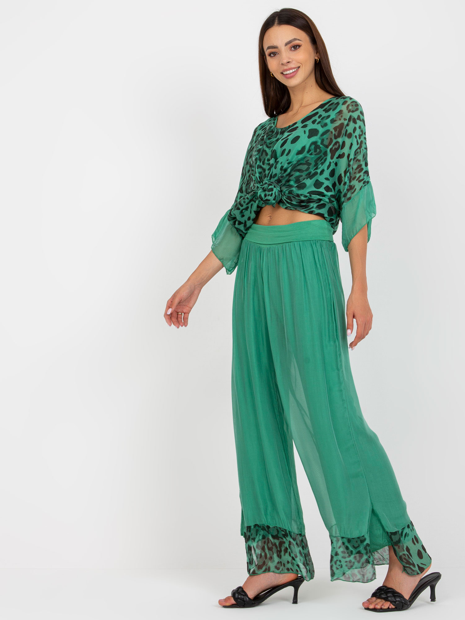 Ciemnozielone szerokie spodnie z materiału z jedwabiu .