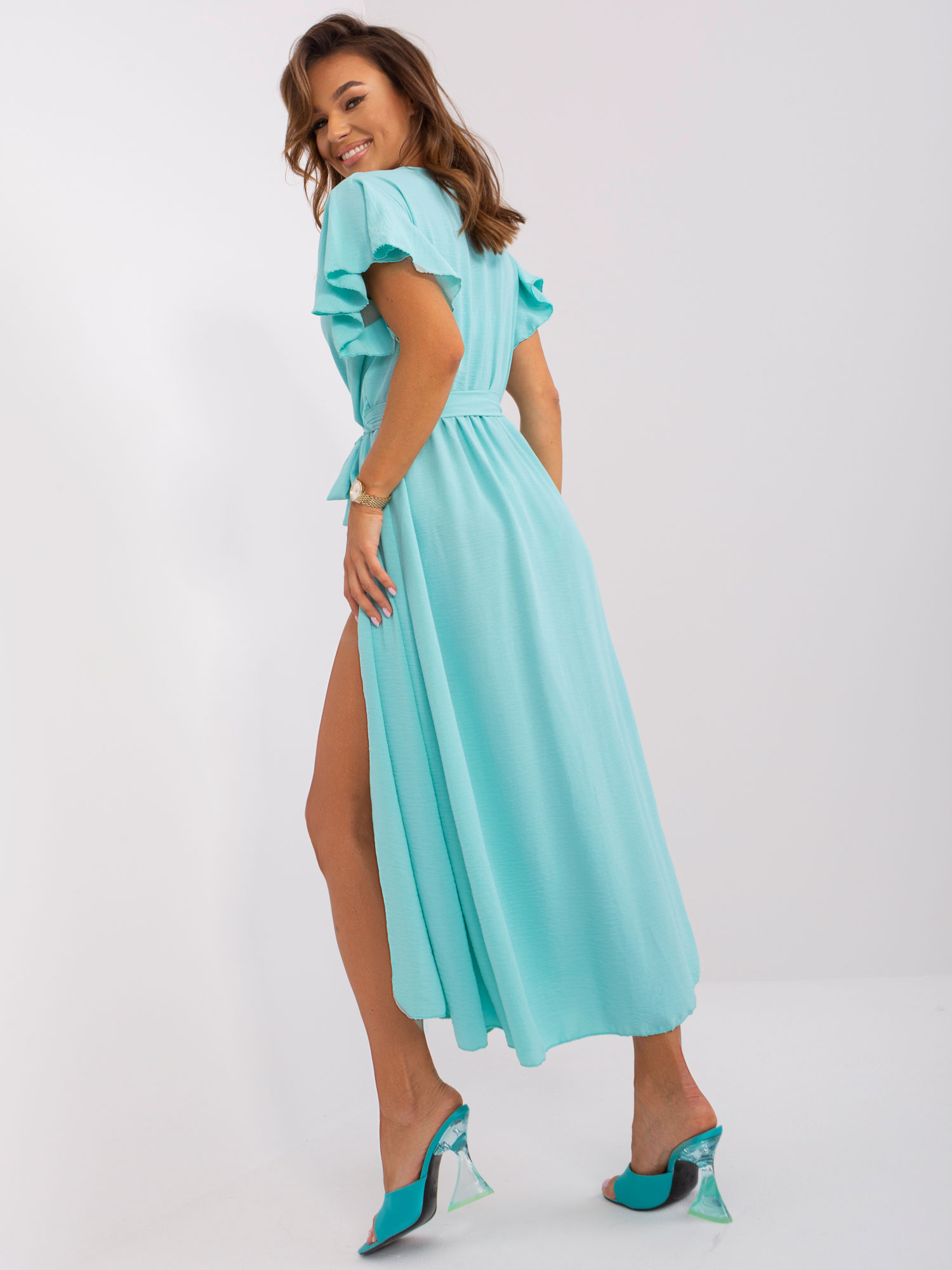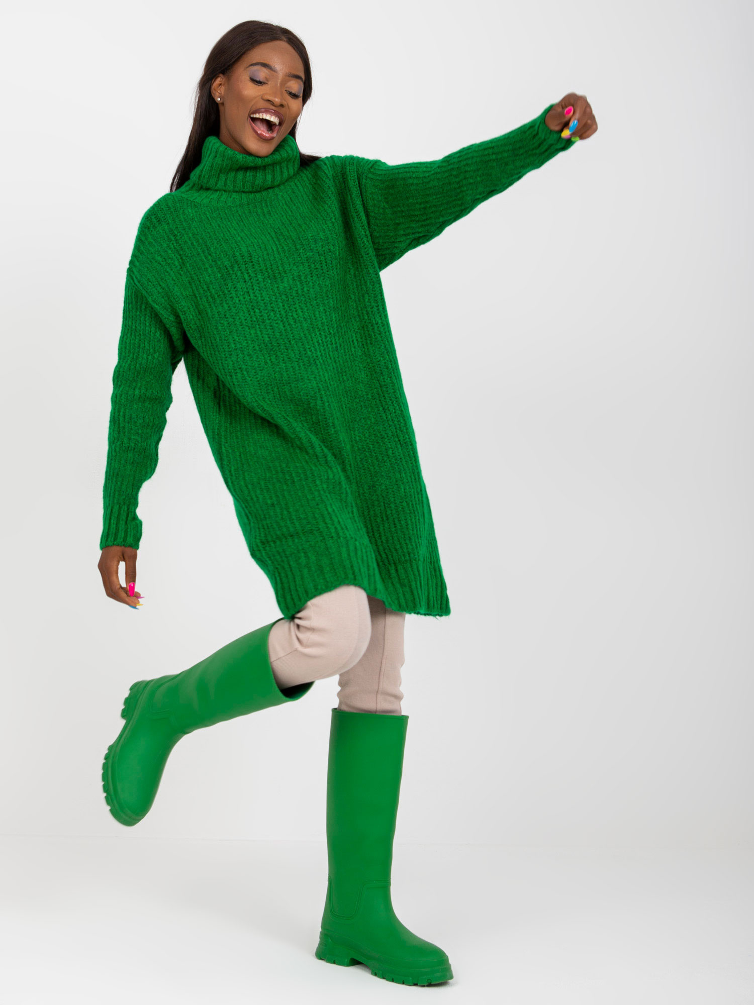 Modelka ma na sobie rozmiar one size. Wymiary modelki: wzrost 176 cm, biust 90 cm, talia 62 cm, biodra 94 cm.