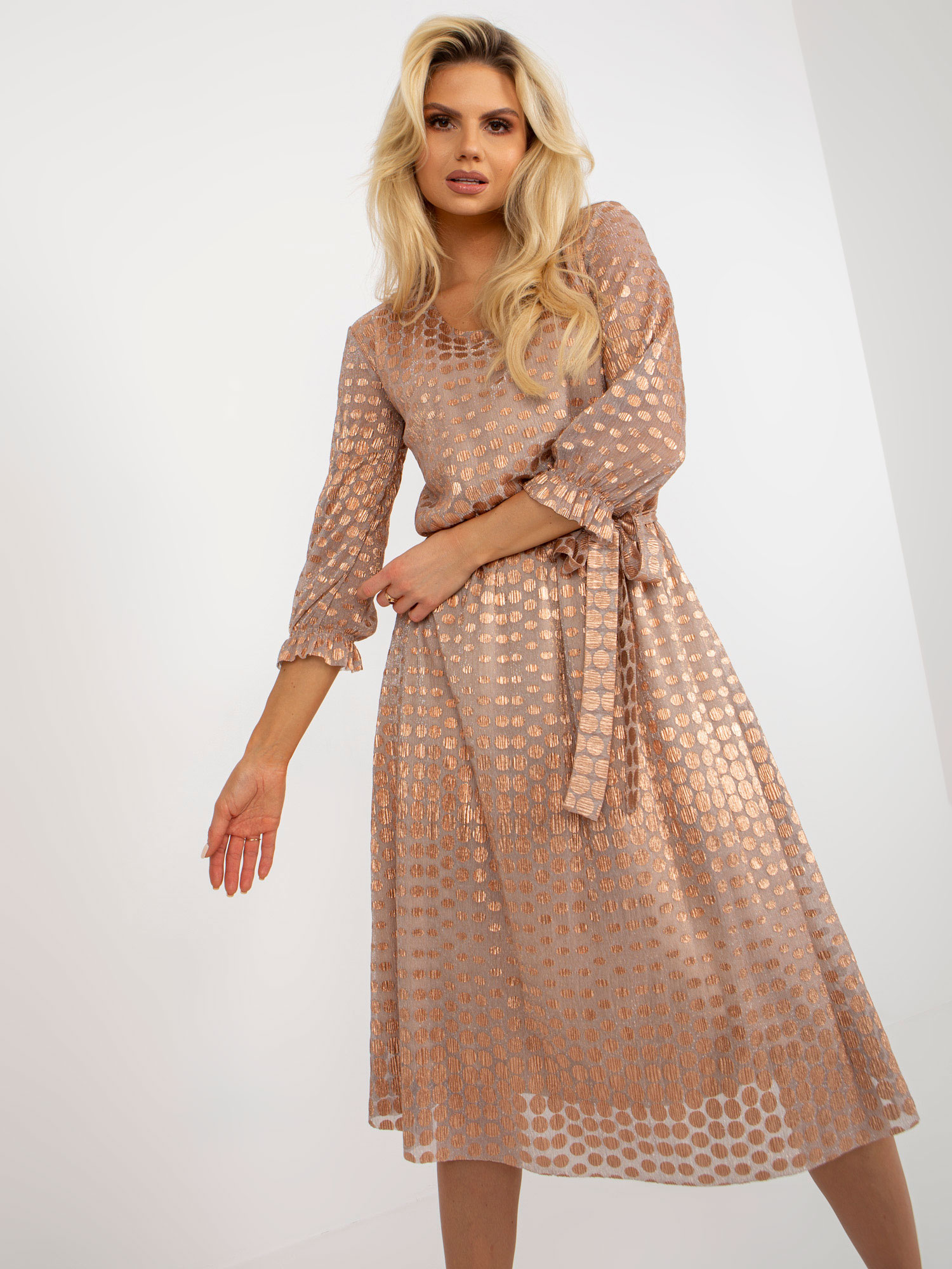 Modelka ma na sobie rozmiar S. Wymiary modelki: wzrost 167 cm, biust 73 cm, talia 64 cm, biodra 91 cm.