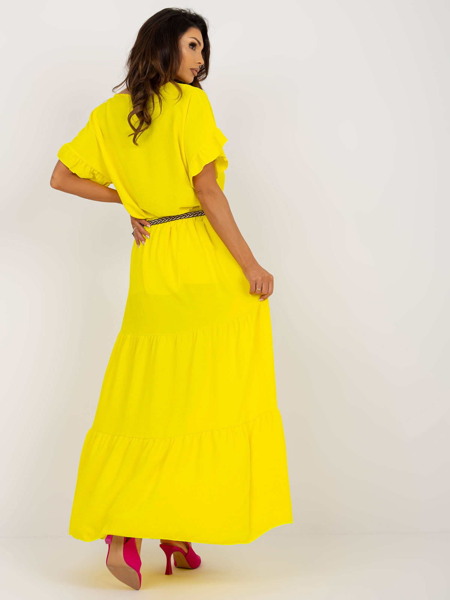 Modelka ma na sobie rozmiar S. Wymiary modelki: wzrost 167 cm, biust 82 cm, talia 59 cm, biodra 83 cm.