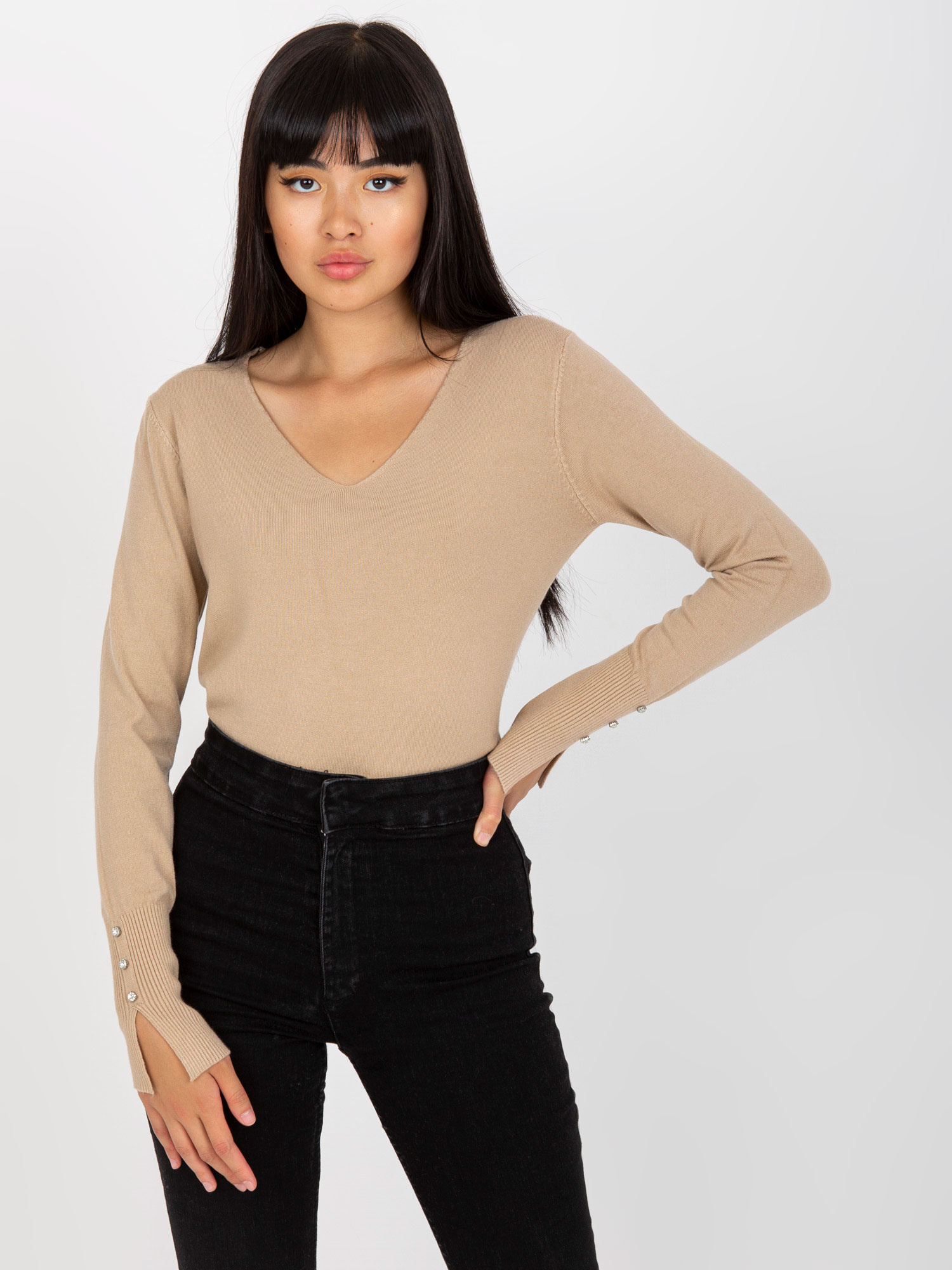 Modelka ma na sobie rozmiar 42. Wymiary modelki: wzrost 172 cm, biust 103 cm, talia 73 cm, biodra 103 cm.