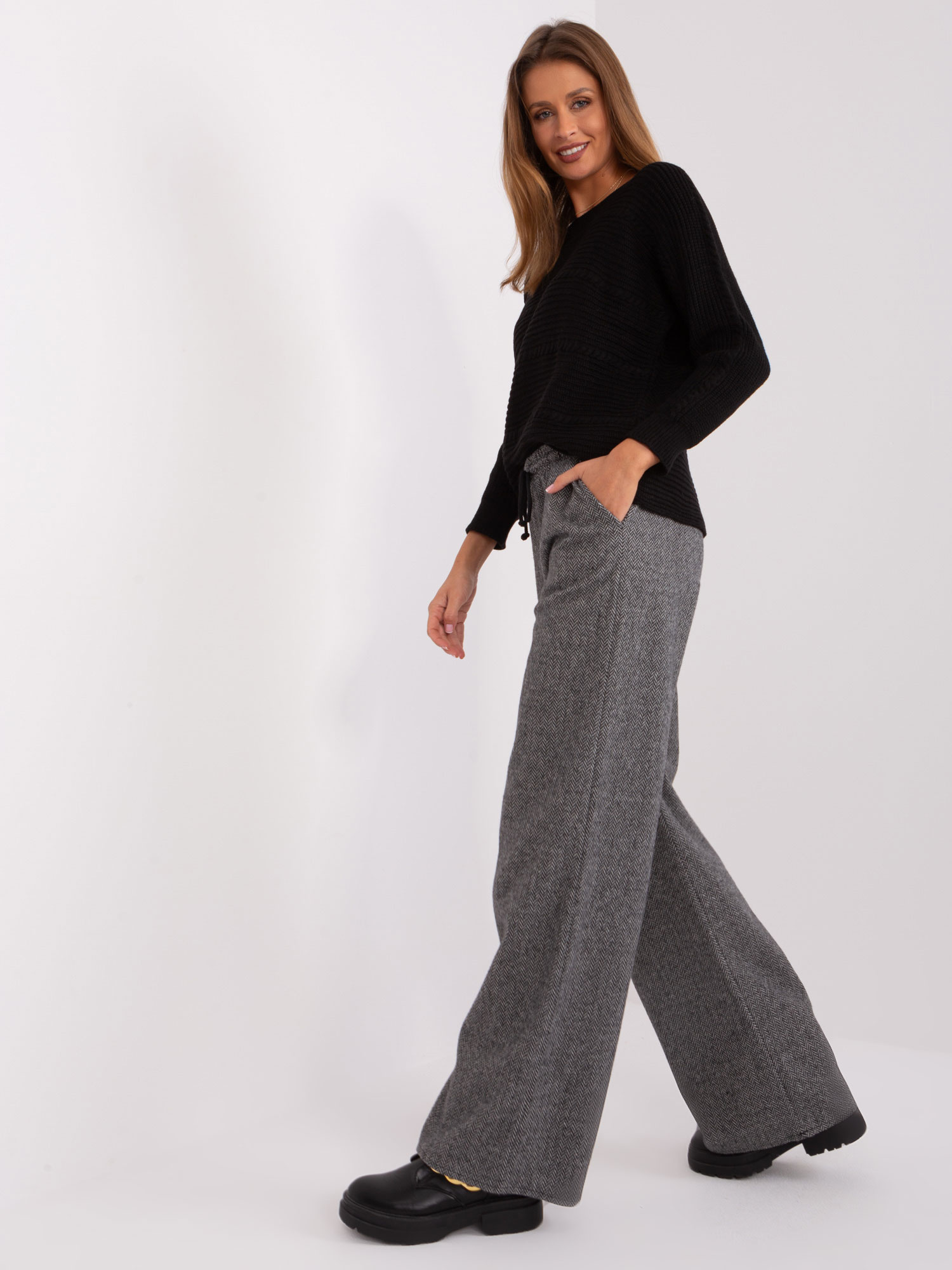 Czarno-szare dzianinowe spodnie w jodełkę .