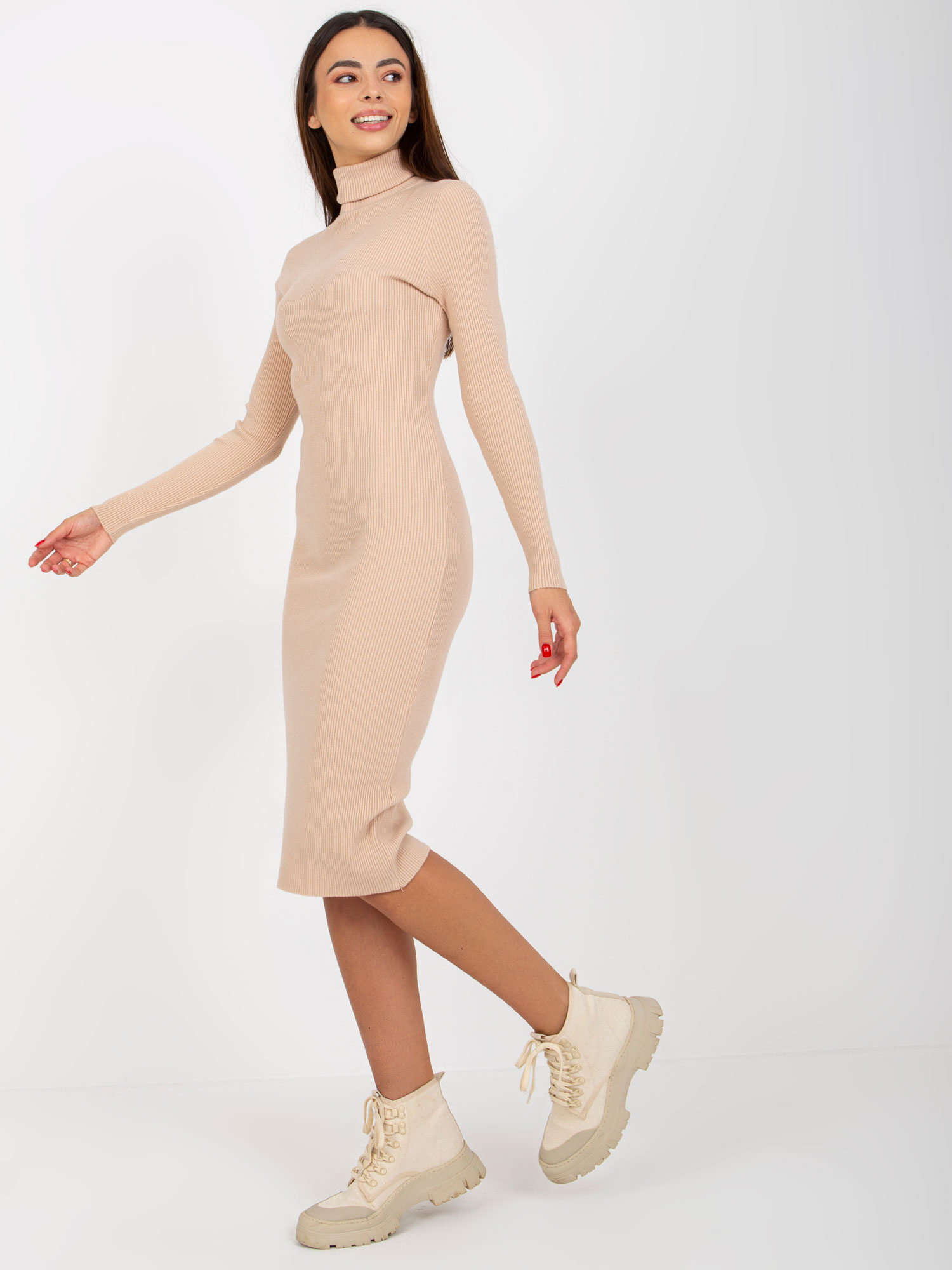 Beżowa sukienka dzianinowa z golfem .