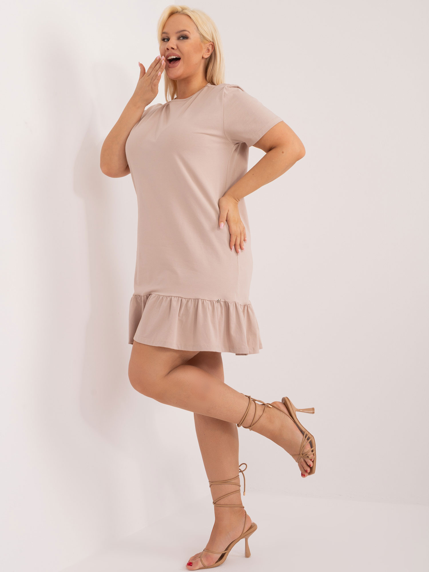 Beżowa sukienka plus size z falbaną.