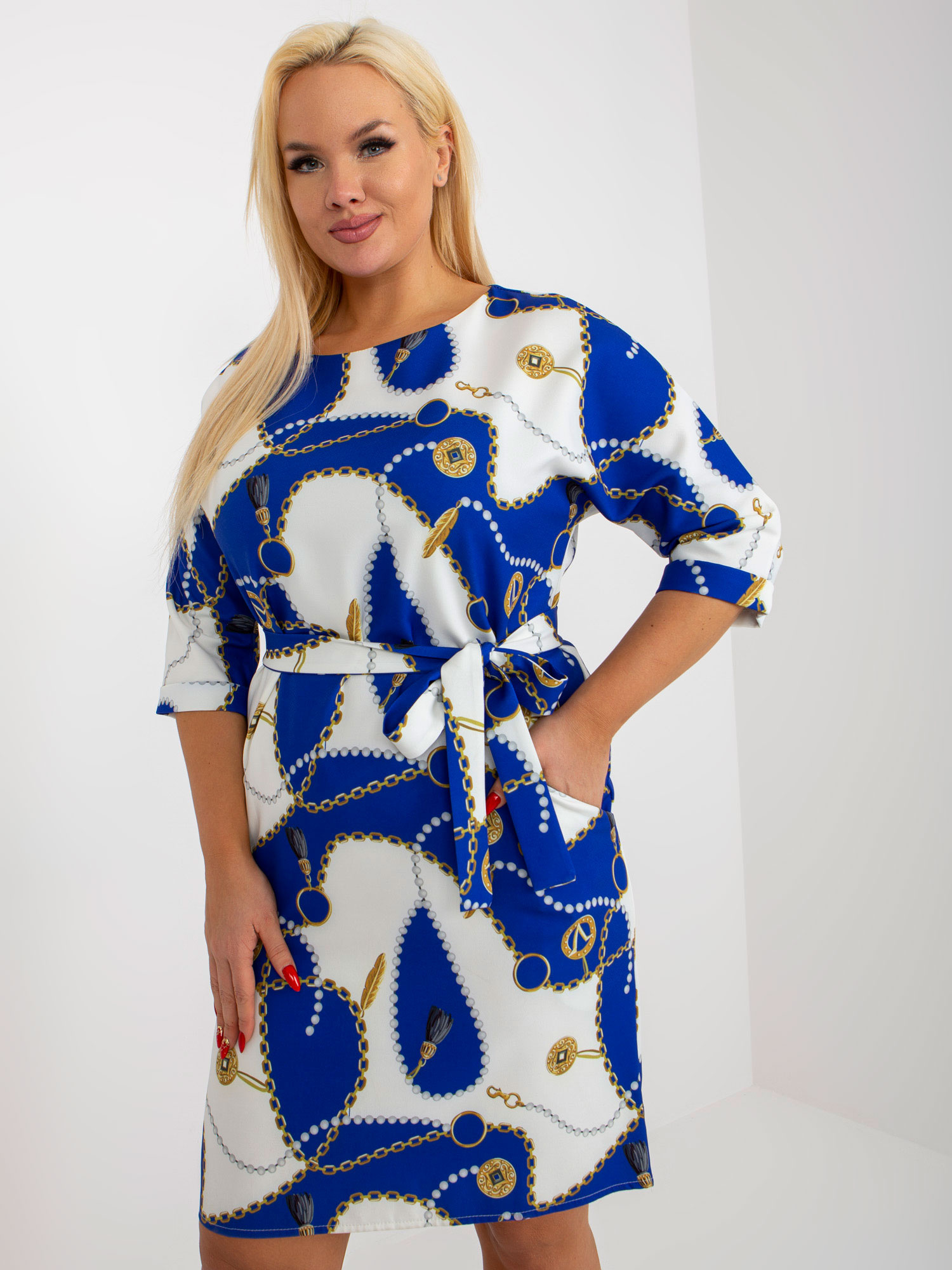 Biało-niebieska elegancka sukienka plus size z nadrukiem.