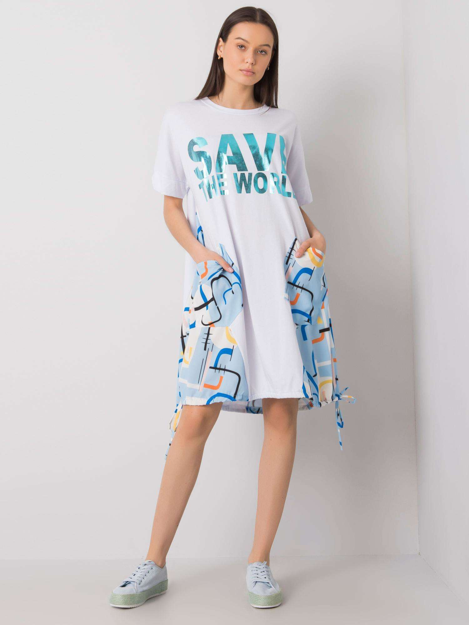Biało-niebieska sukienka z kieszeniami.