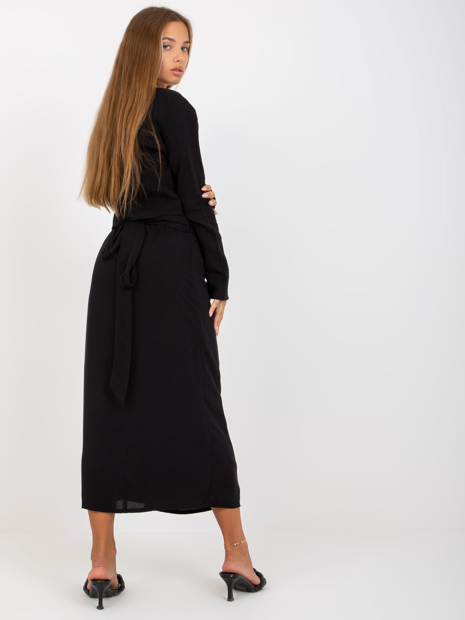 Wymiary sukienki w rozmiarze S/M mierzone na płasko: szerokość pod pachami – 49 cm, długość całkowita – 86 cm, długość rękawa – 57 cm