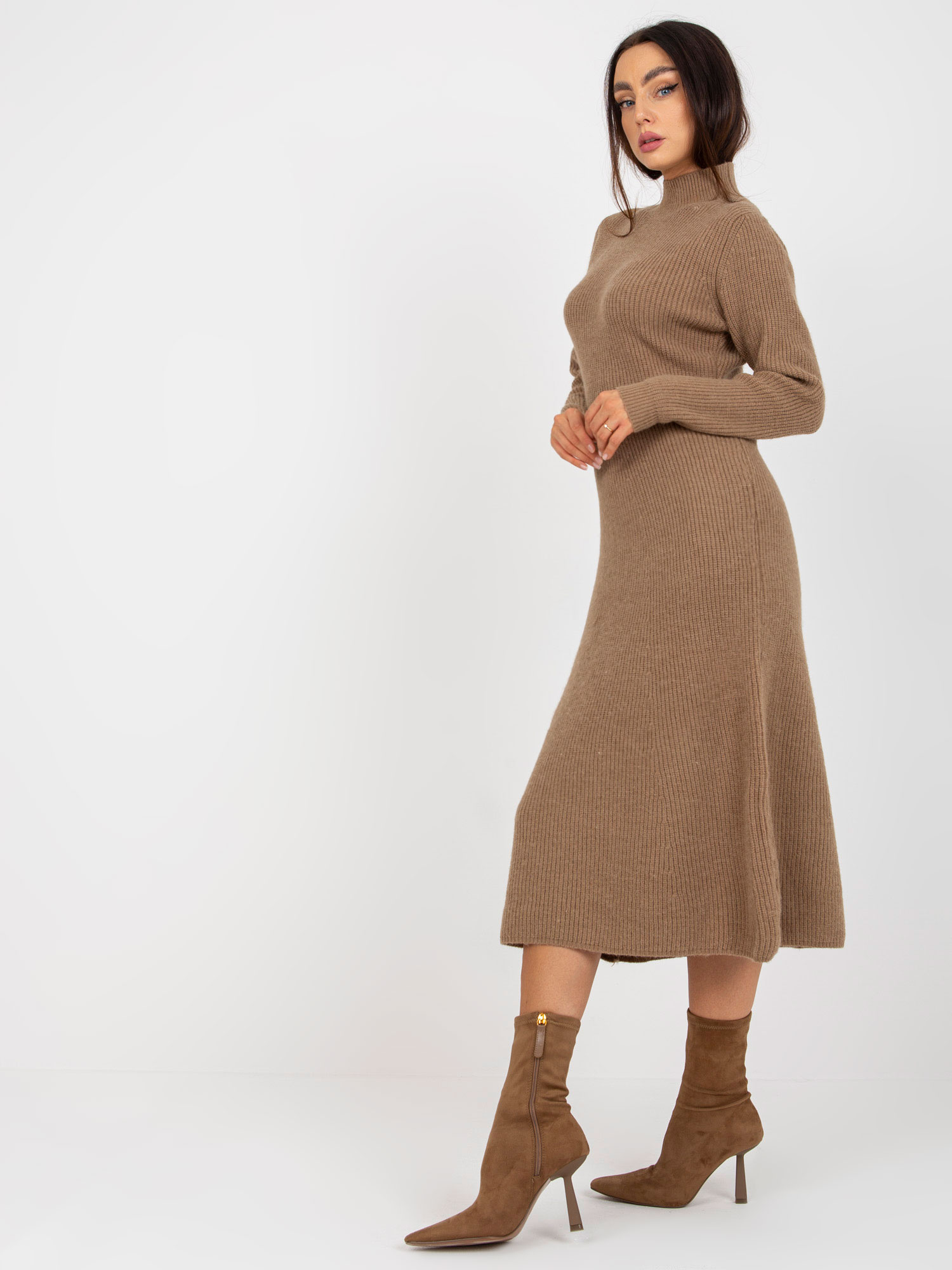 Ciemnobeżowa luźna sukienka dzianinowa z golfem .