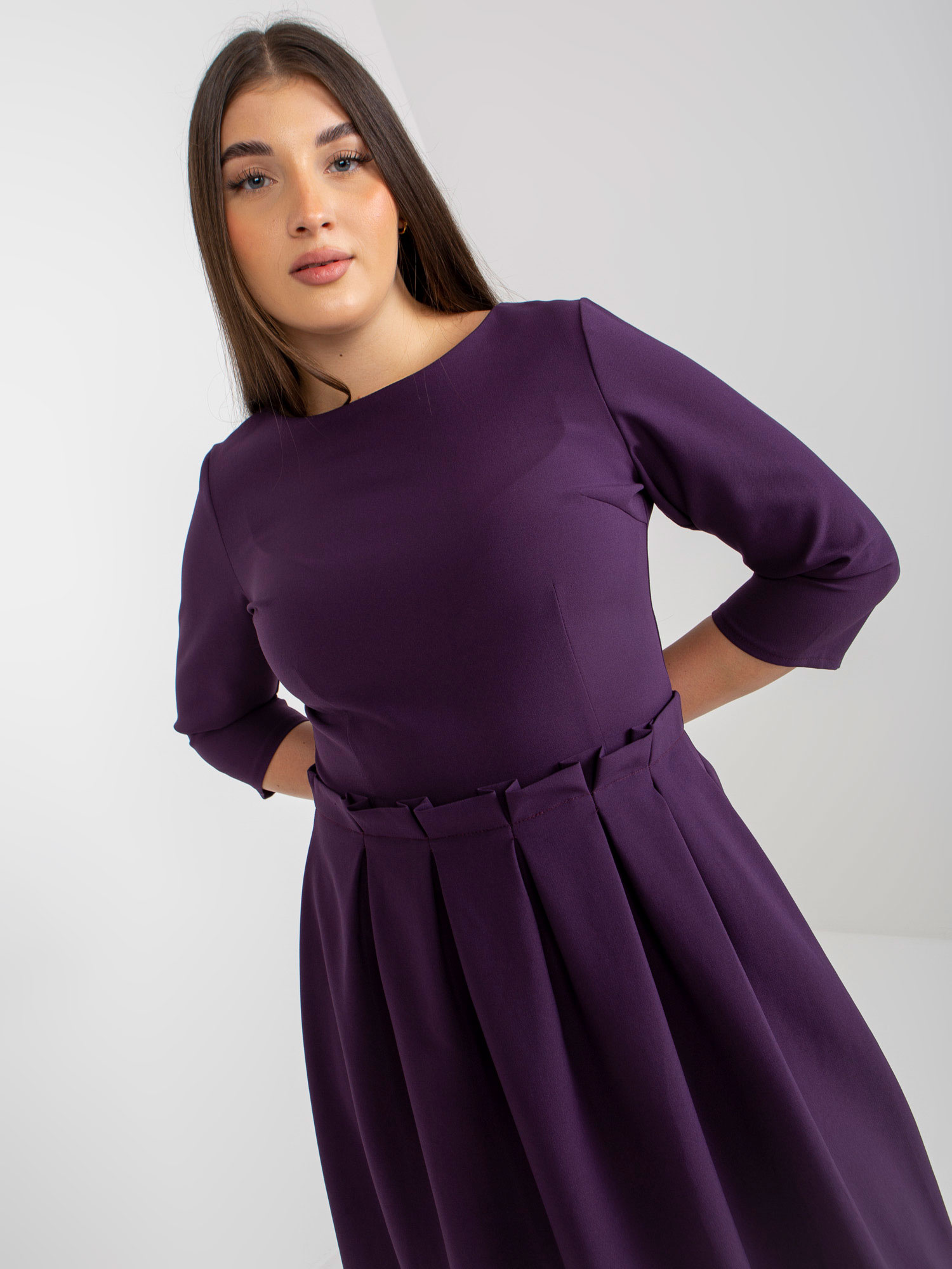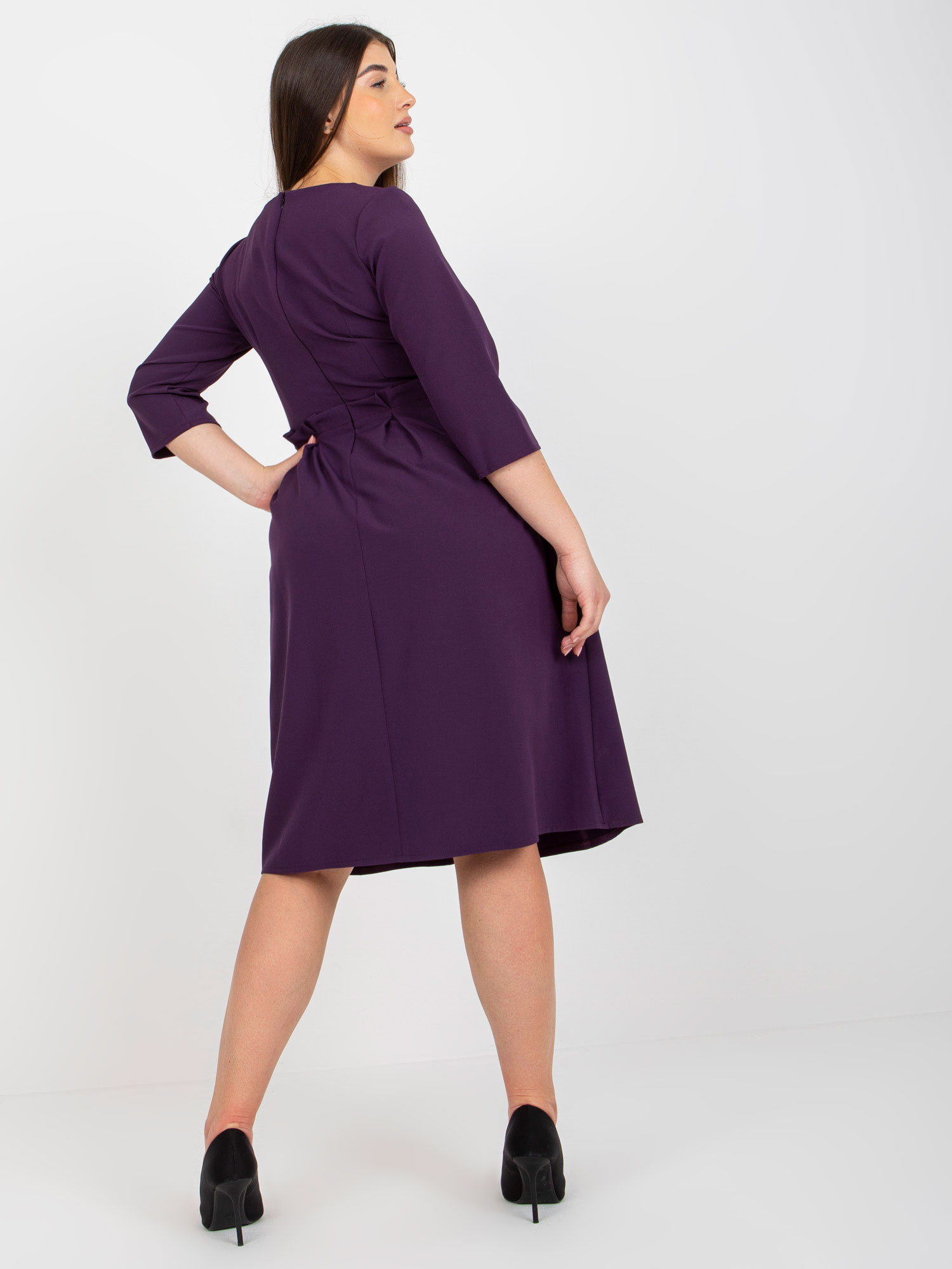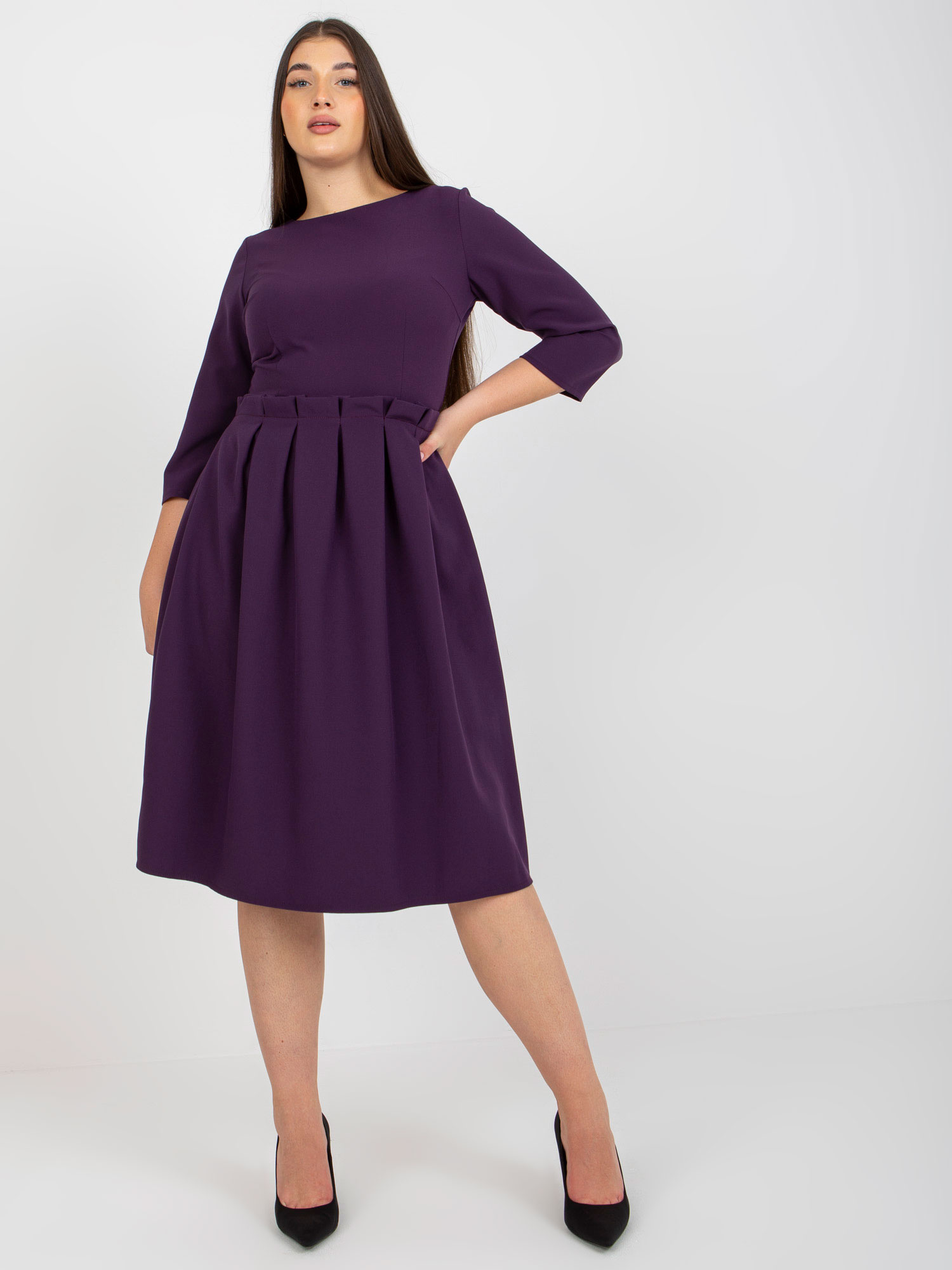 Ciemnofioletowa rozkloszowana sukienka plus size z rękawem 3/4.