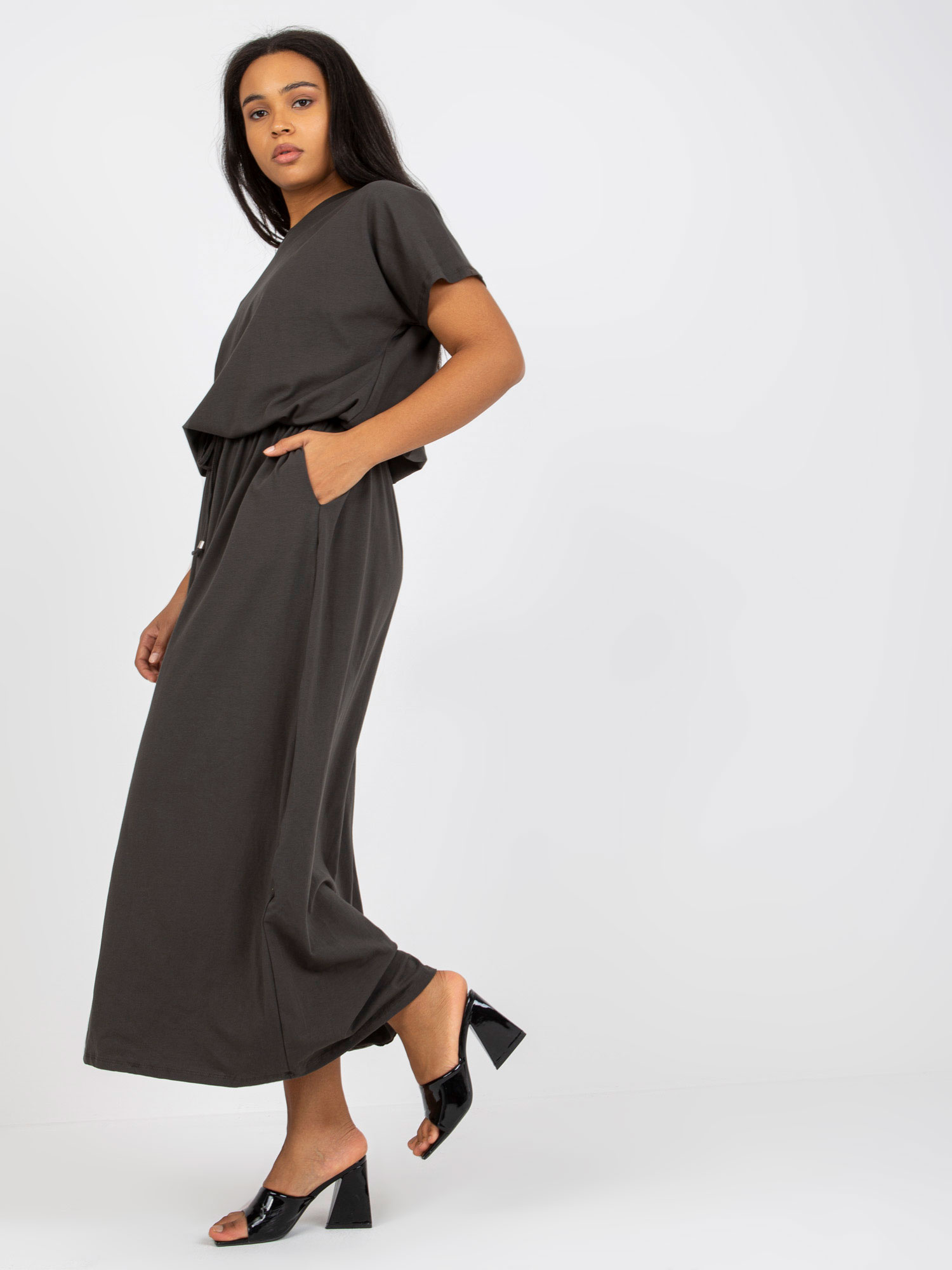 Khaki rozkloszowana sukienka plus size basic z kieszeniami .