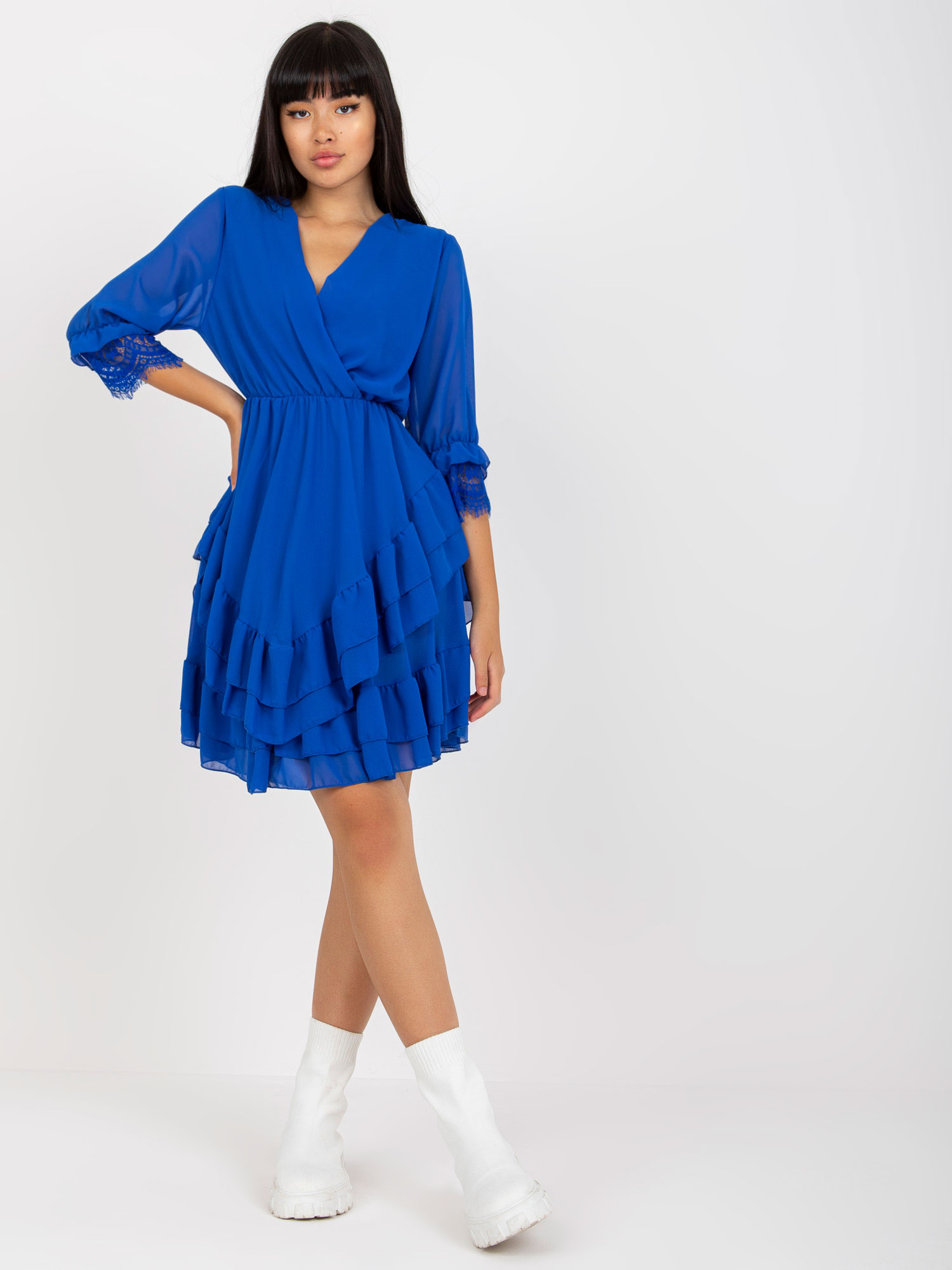 Ciemnoniebieska rozkloszowana sukienka koktajlowa z falbanami .