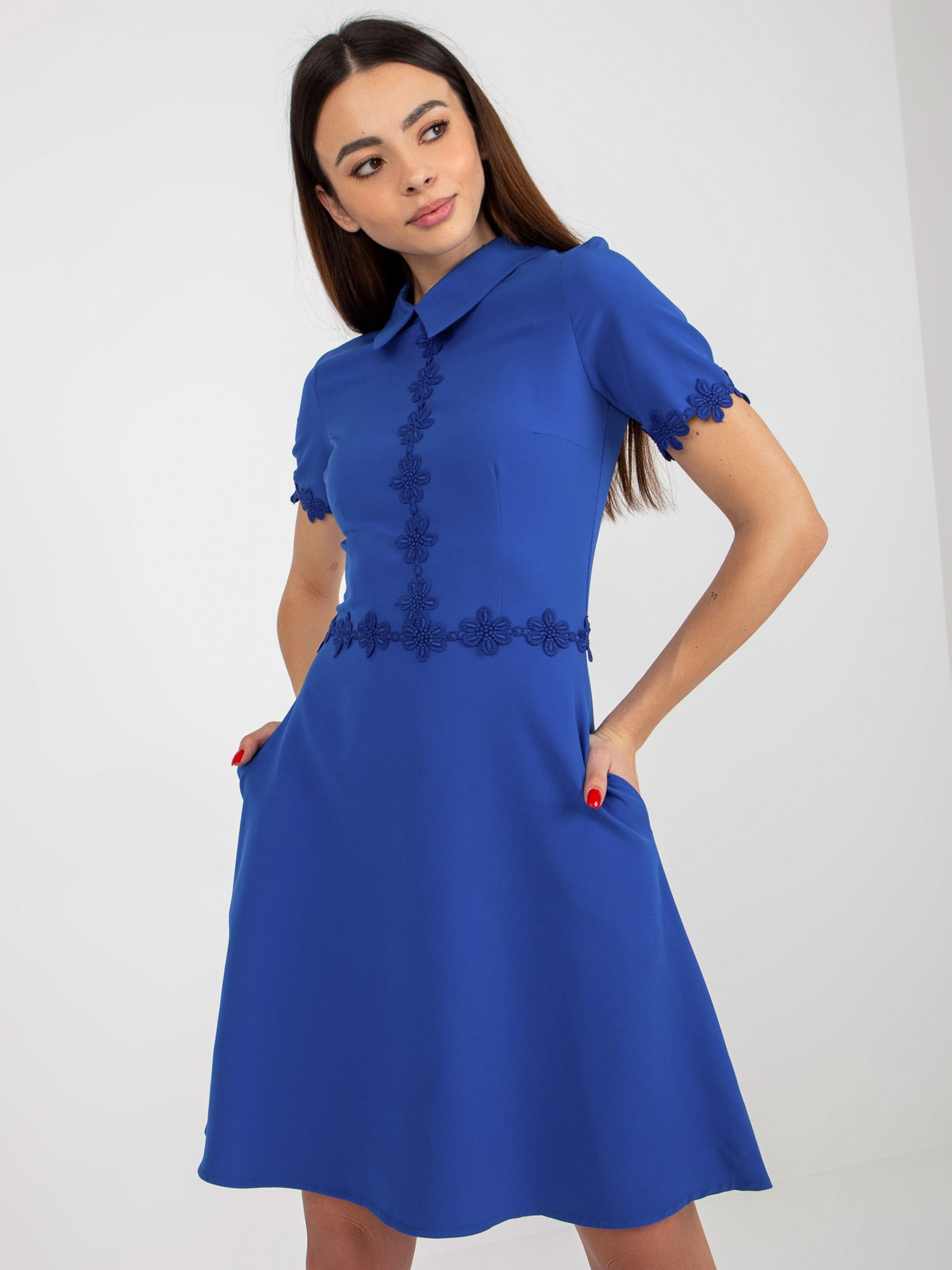 Kobaltowa mini sukienka koktajlowa z kołnierzem .