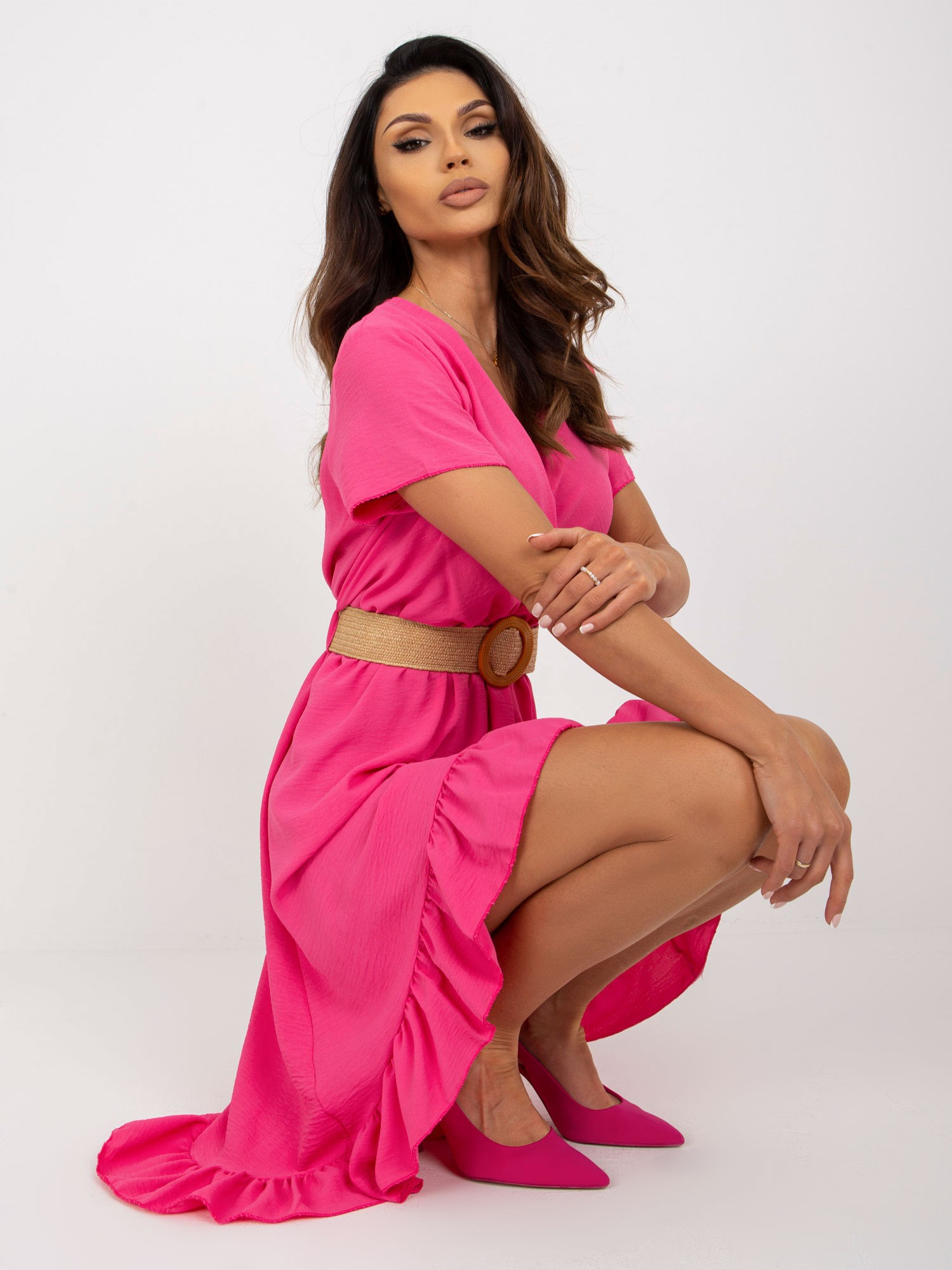 Ciemnoróżowa sukienka z falbaną i kopertowym dekoltem .
