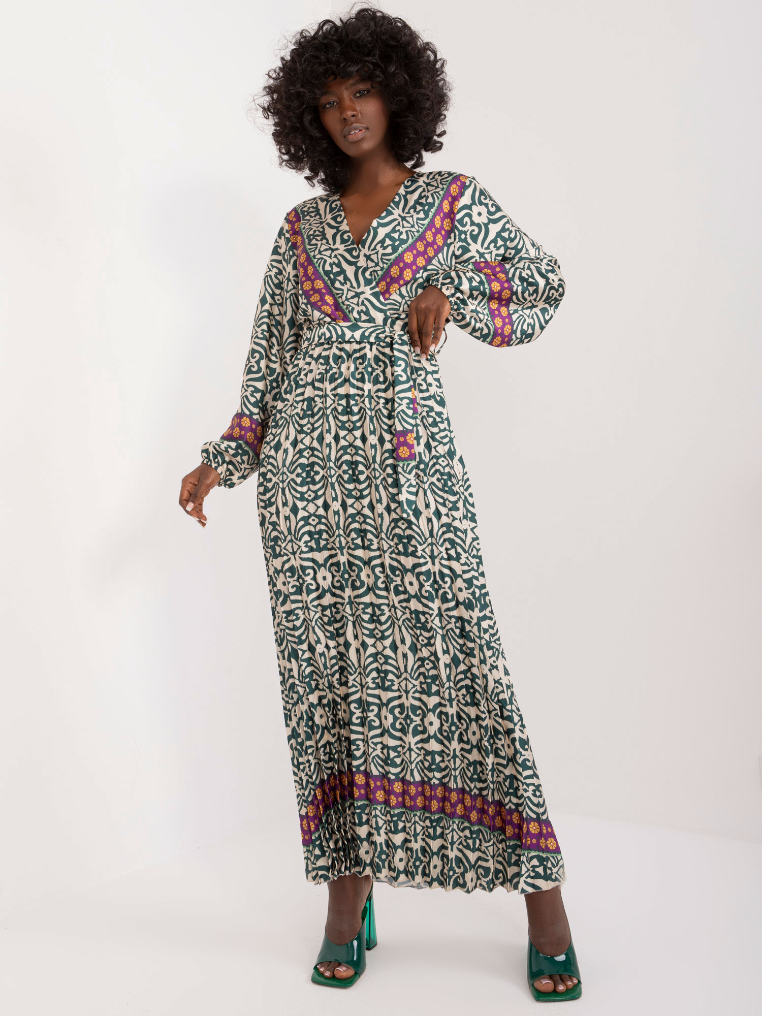 Wymiary sukienki w rozmiarze one size mierzone na płasko: szerokość pod pachami – 39 cm, długość rękawa – 57 cm, długość całkowita – 136 cm.
