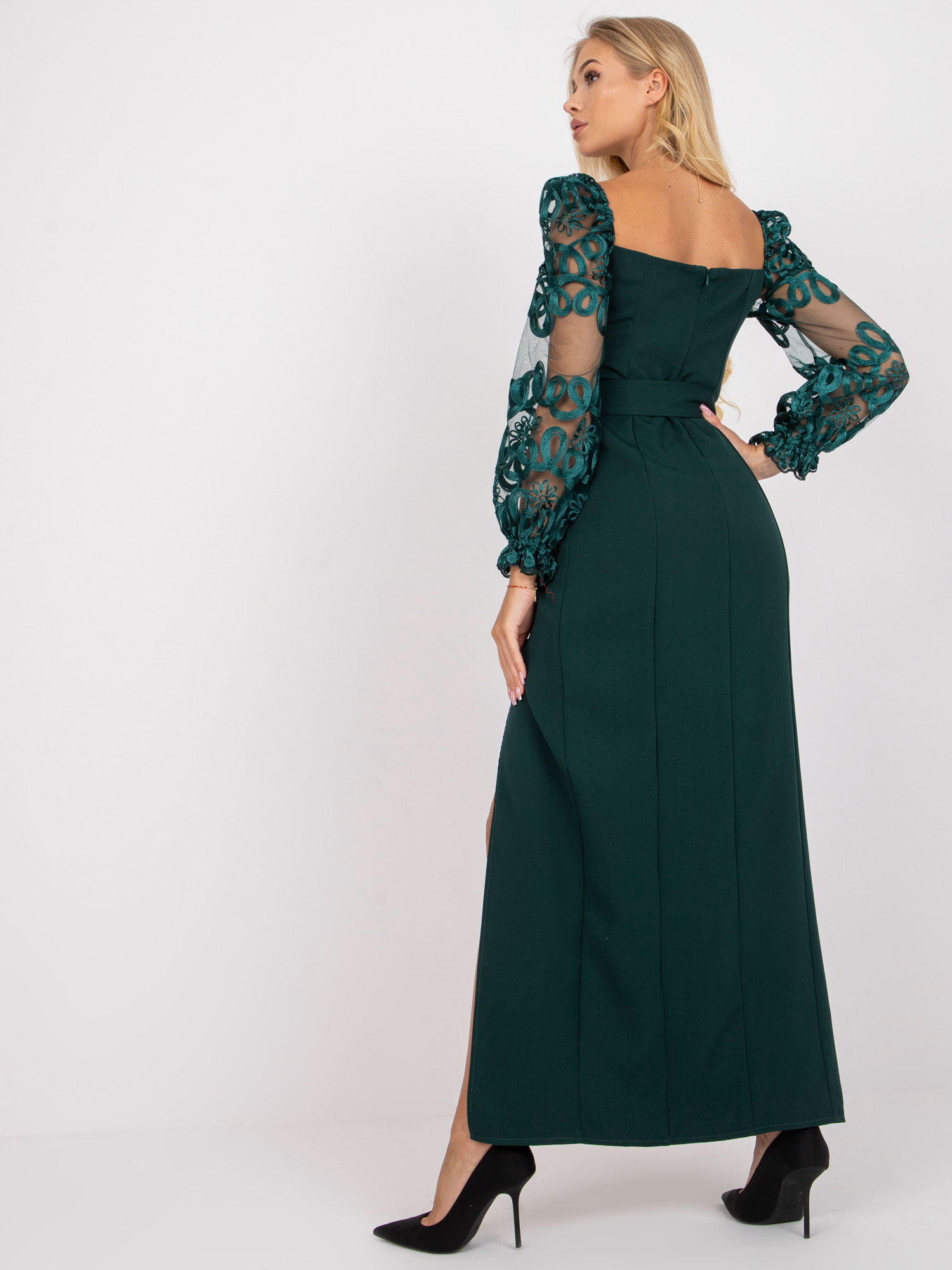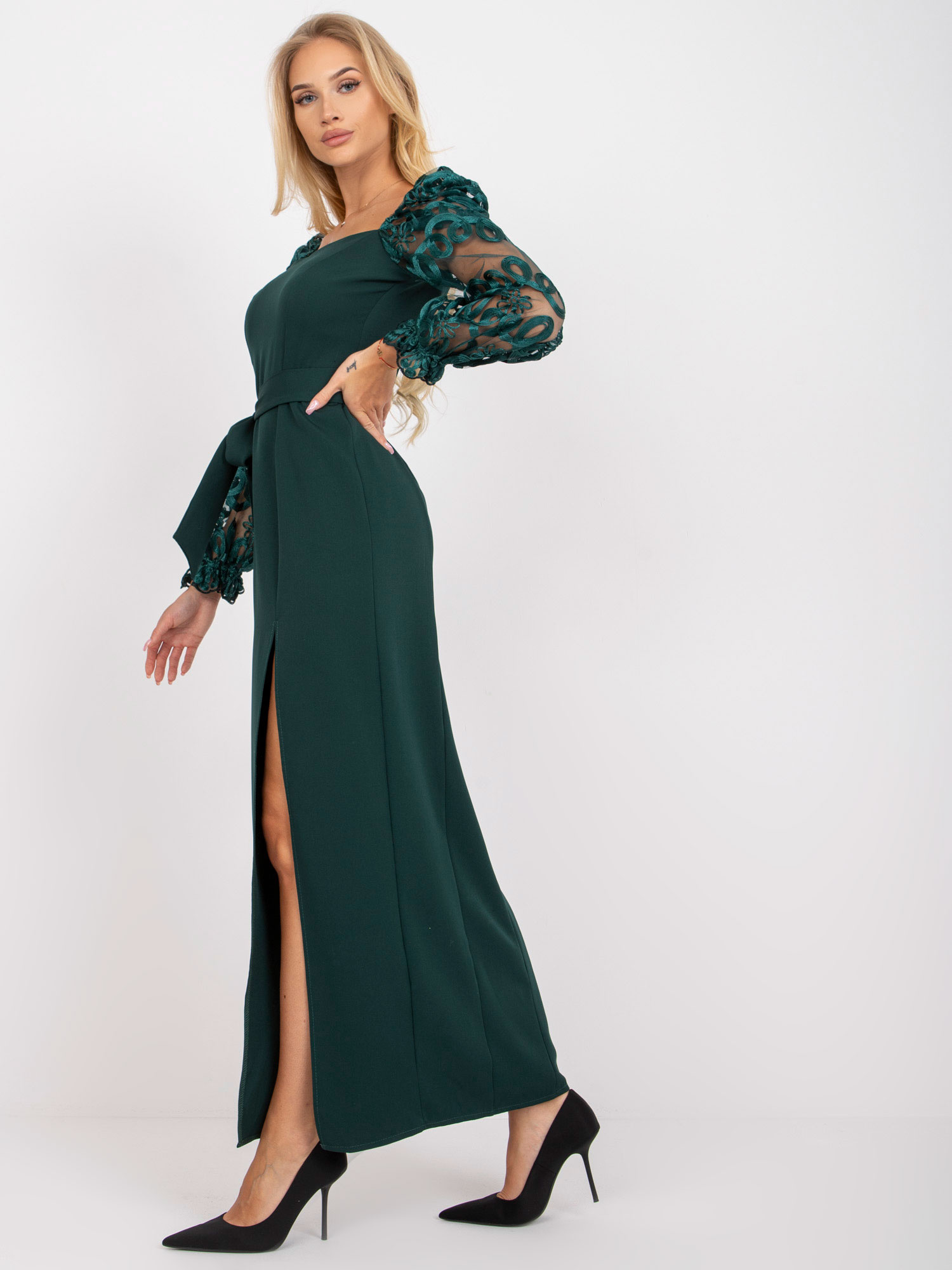 Wymiary sukienki w rozmiarze 36 mierzone na płasko: szerokość pod pachami – 43 cm, długość rękawa – 65 cm, długość całkowita – 146 cm.