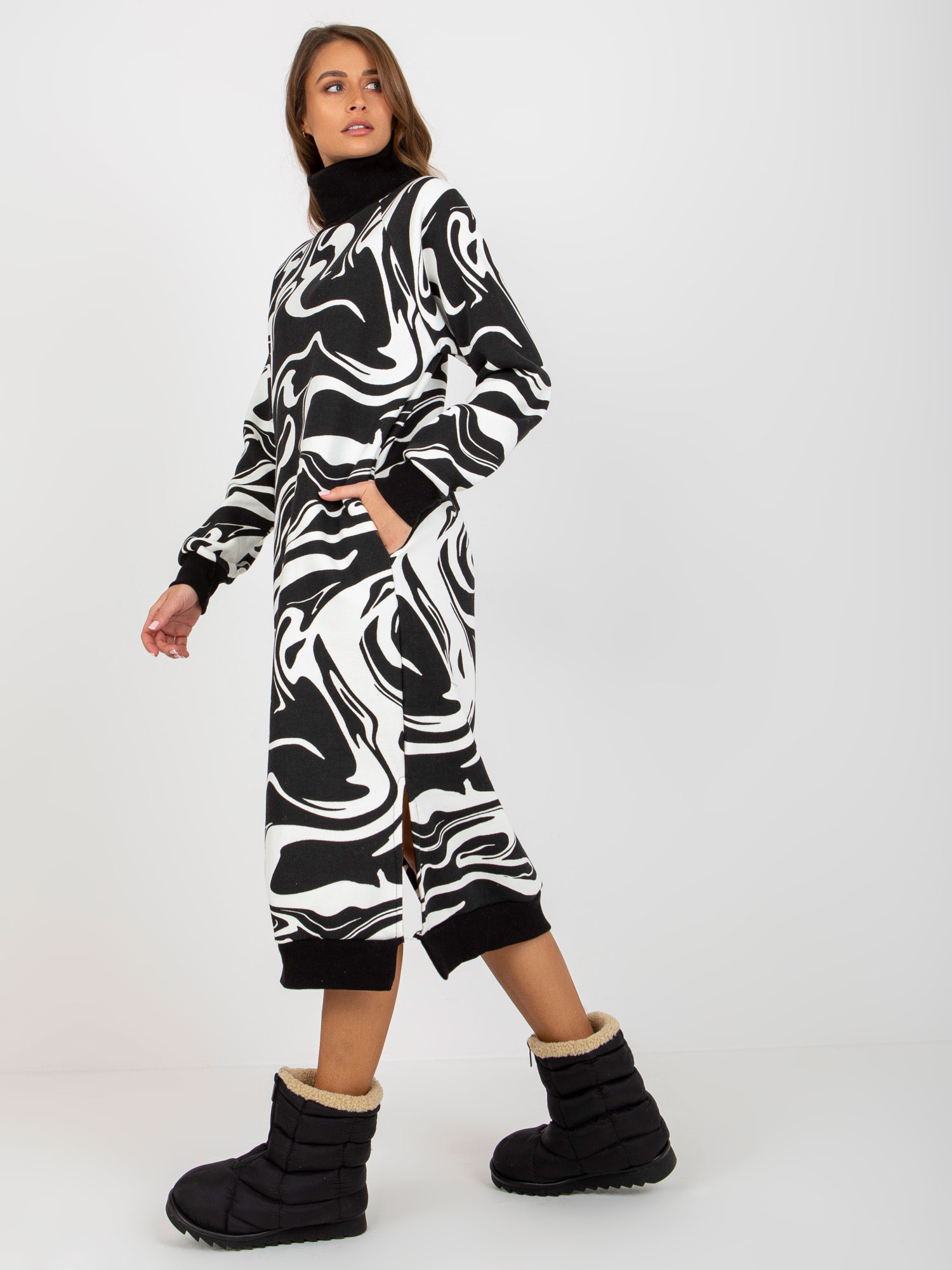 Czarno-biała midi sukienka dresowa z rozcięciami .