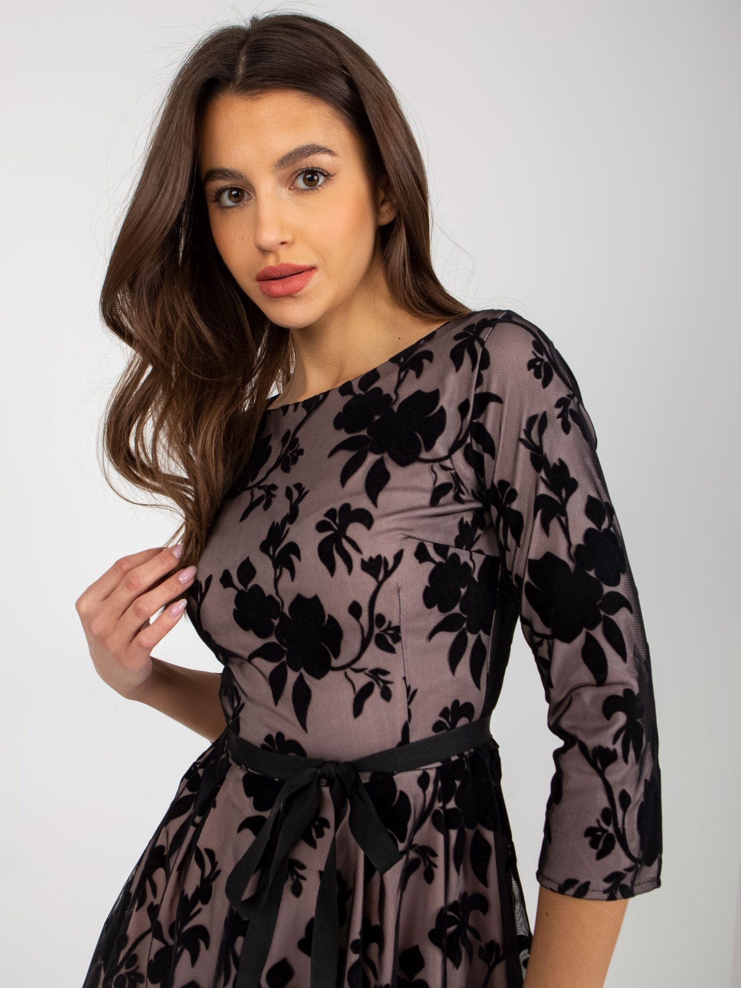 Brudnoróżowo-czarna sukienka koktajlowa w welurowe wzory .