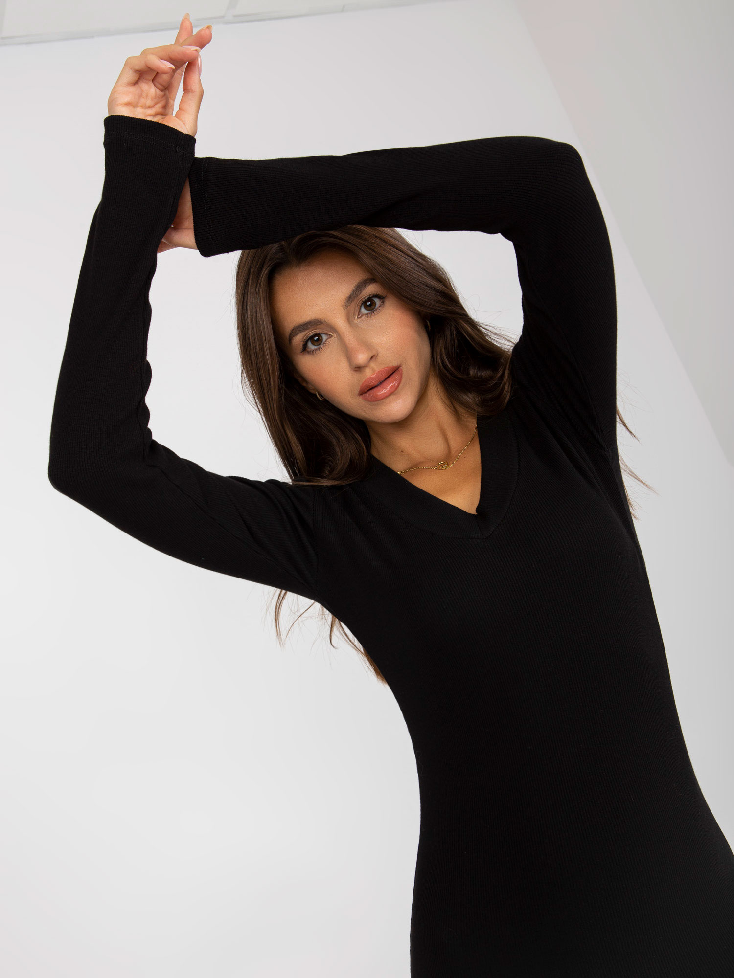 Czarna damska sukienka basic w prążki z dekoltem w serek.