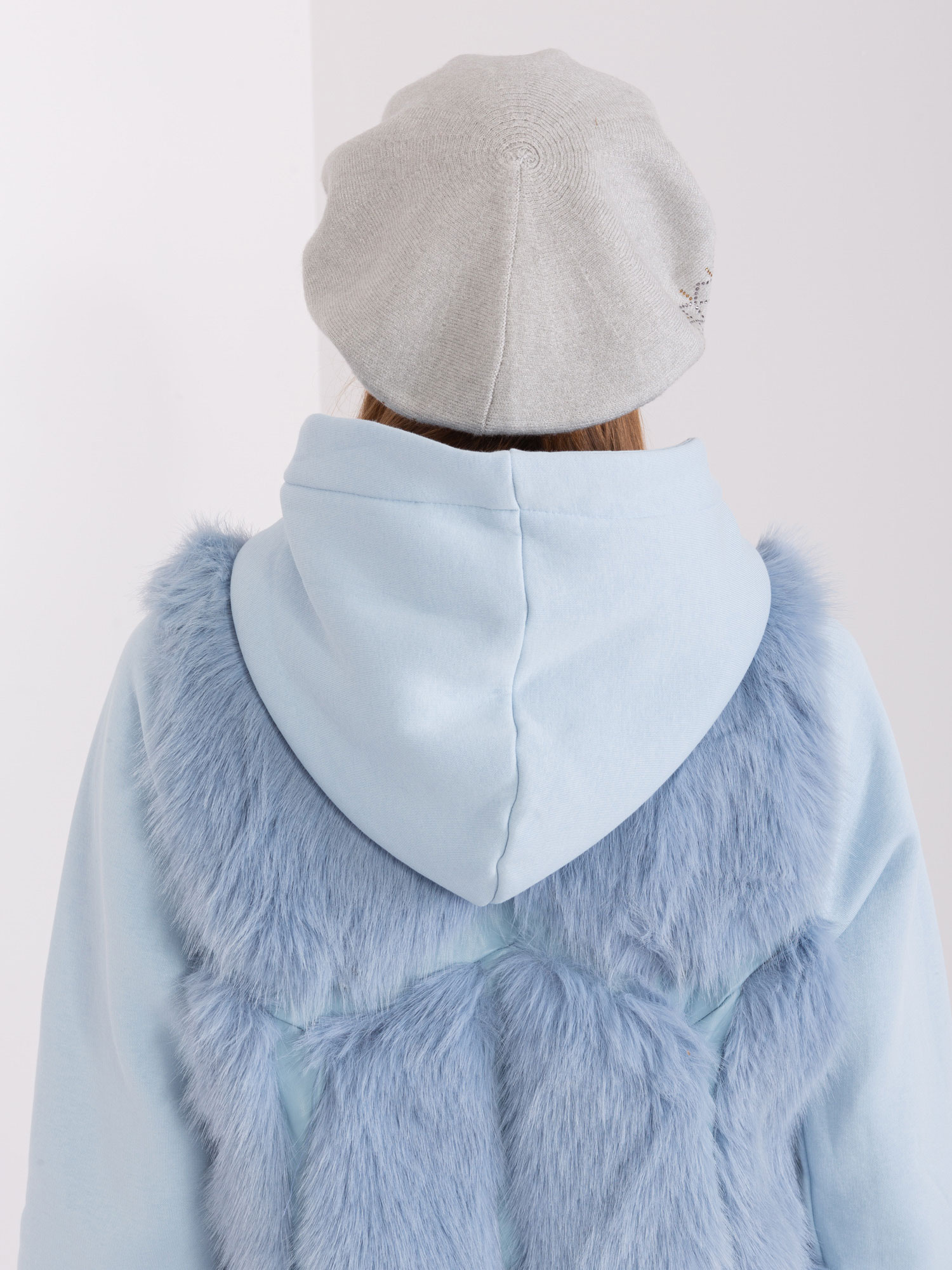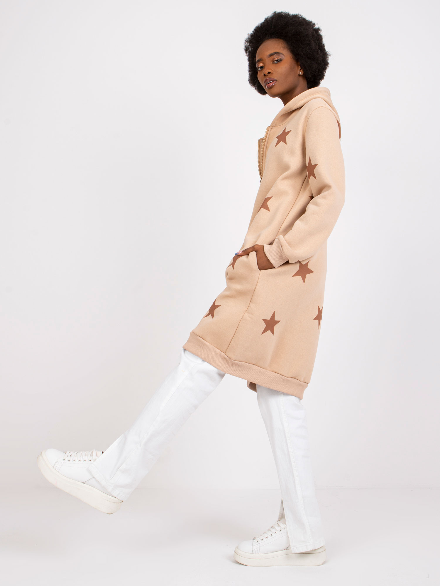 Modelka ma na sobie rozmiar one size. Wymiary modelki: wzrost 175 cm, biust 85 cm, talia 63 cm, biodra 95 cm.