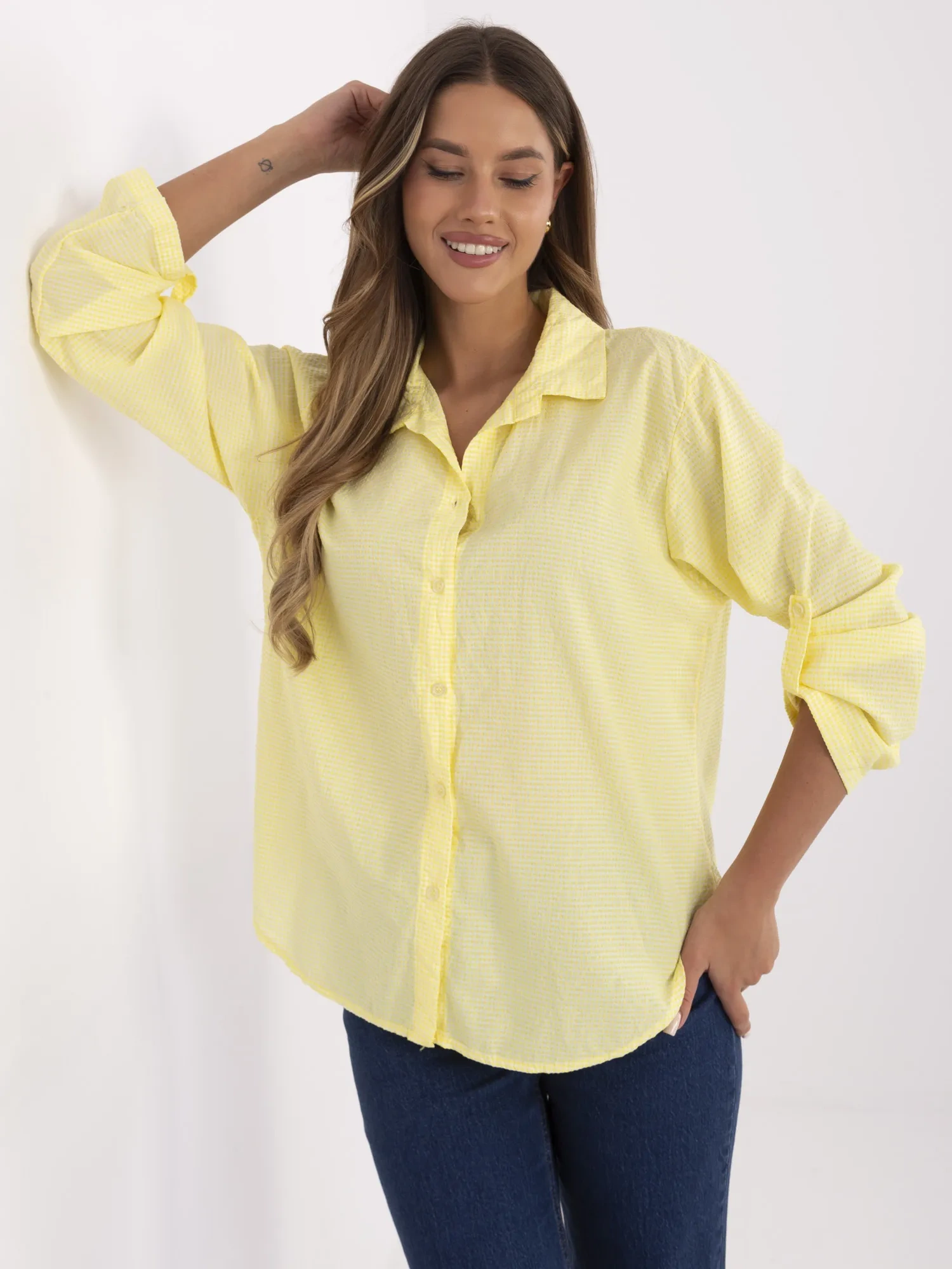 Modelka ma na sobie rozmiar 36. Wymiary modelki: wzrost 173 cm, biust 81 cm, talia 60 cm, biodra 90 cm.