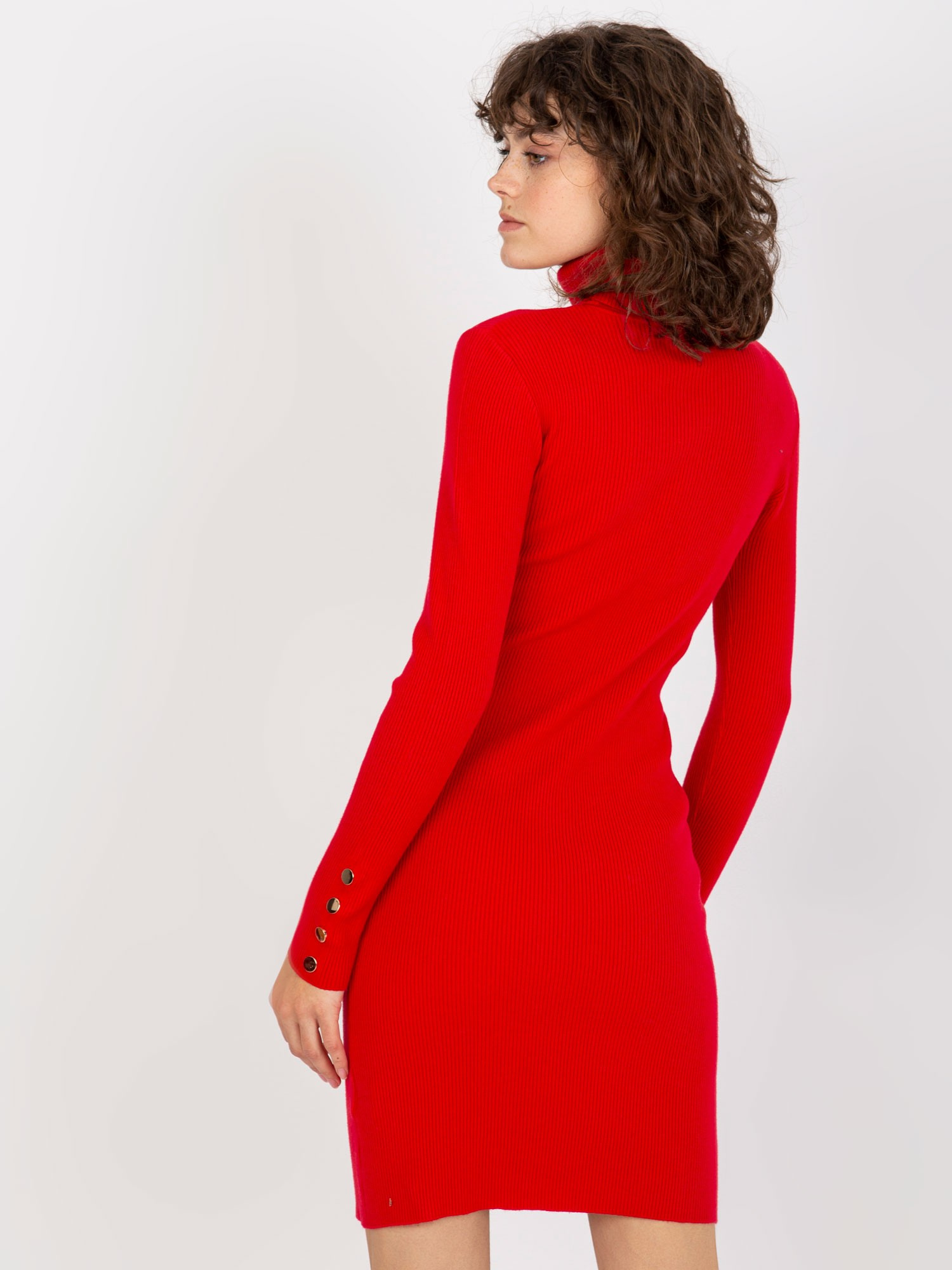 Czerwona sukienka dzianinowa z guzikami przy rękawach .